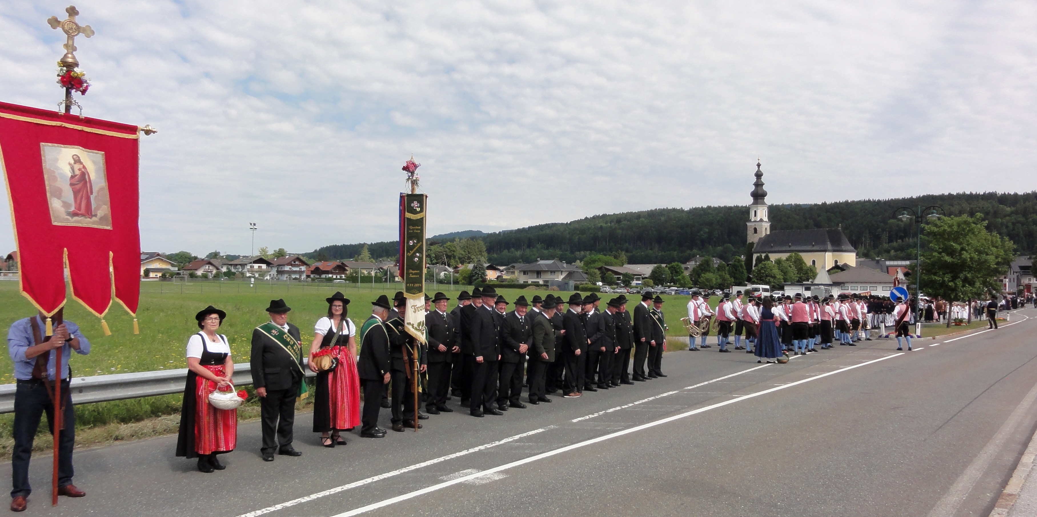 - Der Thalgauer Kameradschaftsbund bei der Teilnahme an der Fronleichnamsprozession im Jahr 2019. Ganz vorne die Prozessionsfahne, die in traditioneller Weise vom Zechprobst getragen wird.