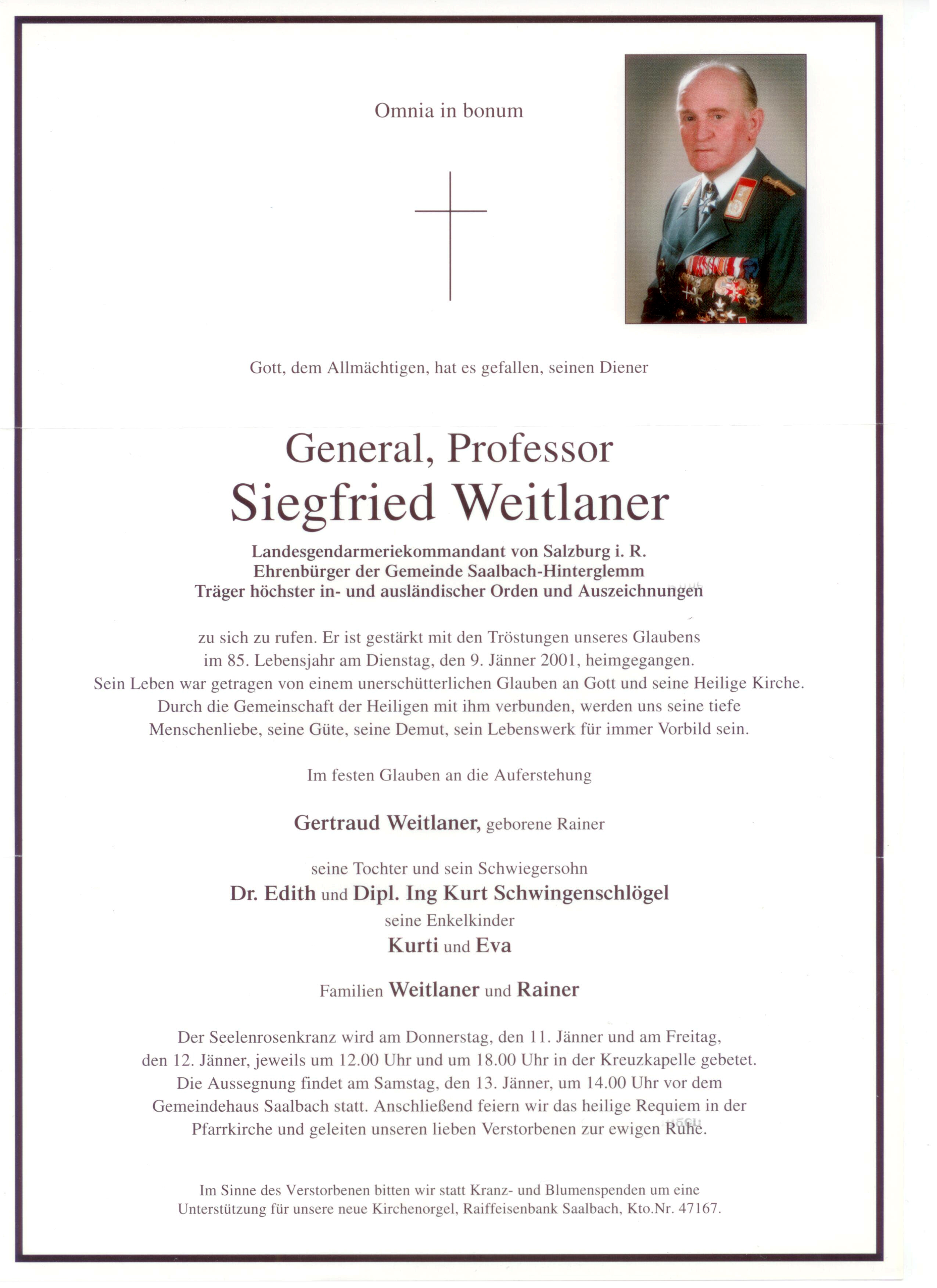 General Prof. Siegfried Weitlaner (* 9. Juni 1916 in Saalbach; † 9. Jänner 2001 in der Stadt Salzburg)[1] war Landesgendarmeriekommandant von Salzburg.
