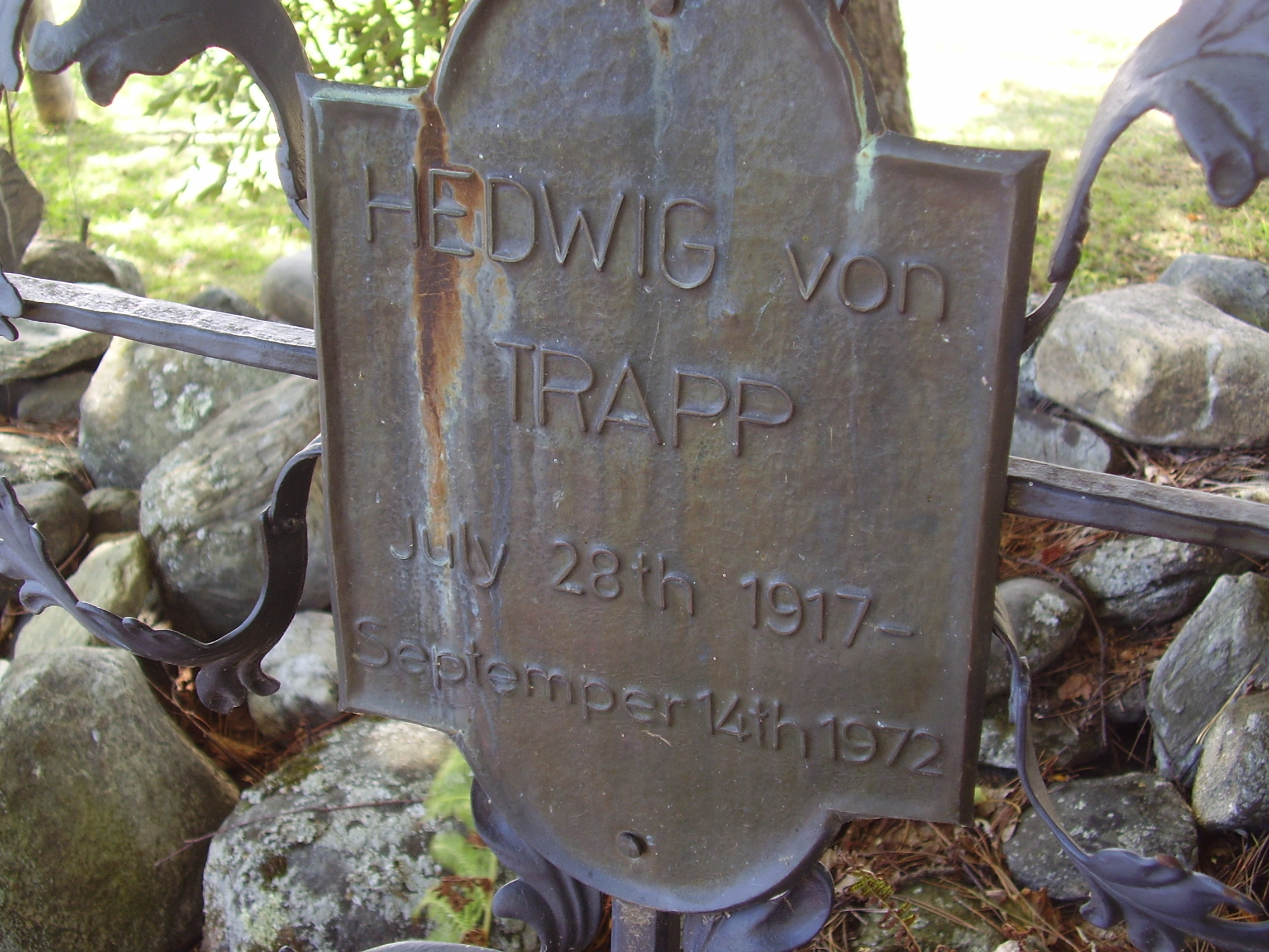 | 20:32, 19. Mär. 2010 | Grabstein Hedwig von Trapp.jpg (Datei) | 846 KB | {{Bildbeschreibung2 |Beschreibung = Der Grabstein von Hedwig von Trapp in Stowe, Vermont |Quelle = Andrea Loidl |Fotograf = Andrea Loidl |Erstelldatum = 28.08. 2009 |Lizenzkommentar = }} | 1 | |
