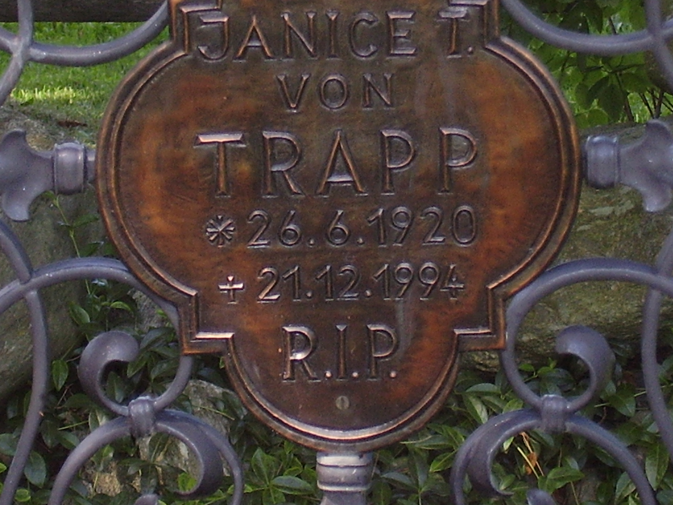 | 20:43, 19. Mär. 2010 | Grabstein Janice von Trapp.jpg (Datei) | 862 KB | {{Bildbeschreibung2 |Beschreibung = Grabstein von Janice Tyre von Trapp in Stowe, Vermont |Quelle = Andrea Loidl |Fotograf = Andrea Loidl |Erstelldatum = 28.08. 2009 |Lizenzkommentar = }} | 1 | |