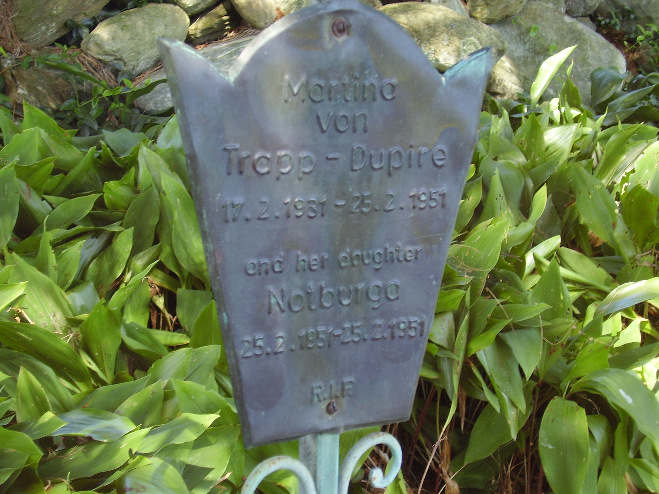 | 20:35, 19. Mär. 2010 | Grabstein Werner von Trapp.JPG (Datei) | 833 KB | {{Bildbeschreibung2 |Beschreibung = Der Grabstein von Werner von Trapp in Stowe, Vermont |Quelle = Andrea Loidl |Fotograf = Andrea Loidl |Erstelldatum = 28.08. 2009 |Lizenzkommentar = }} | 1 | |