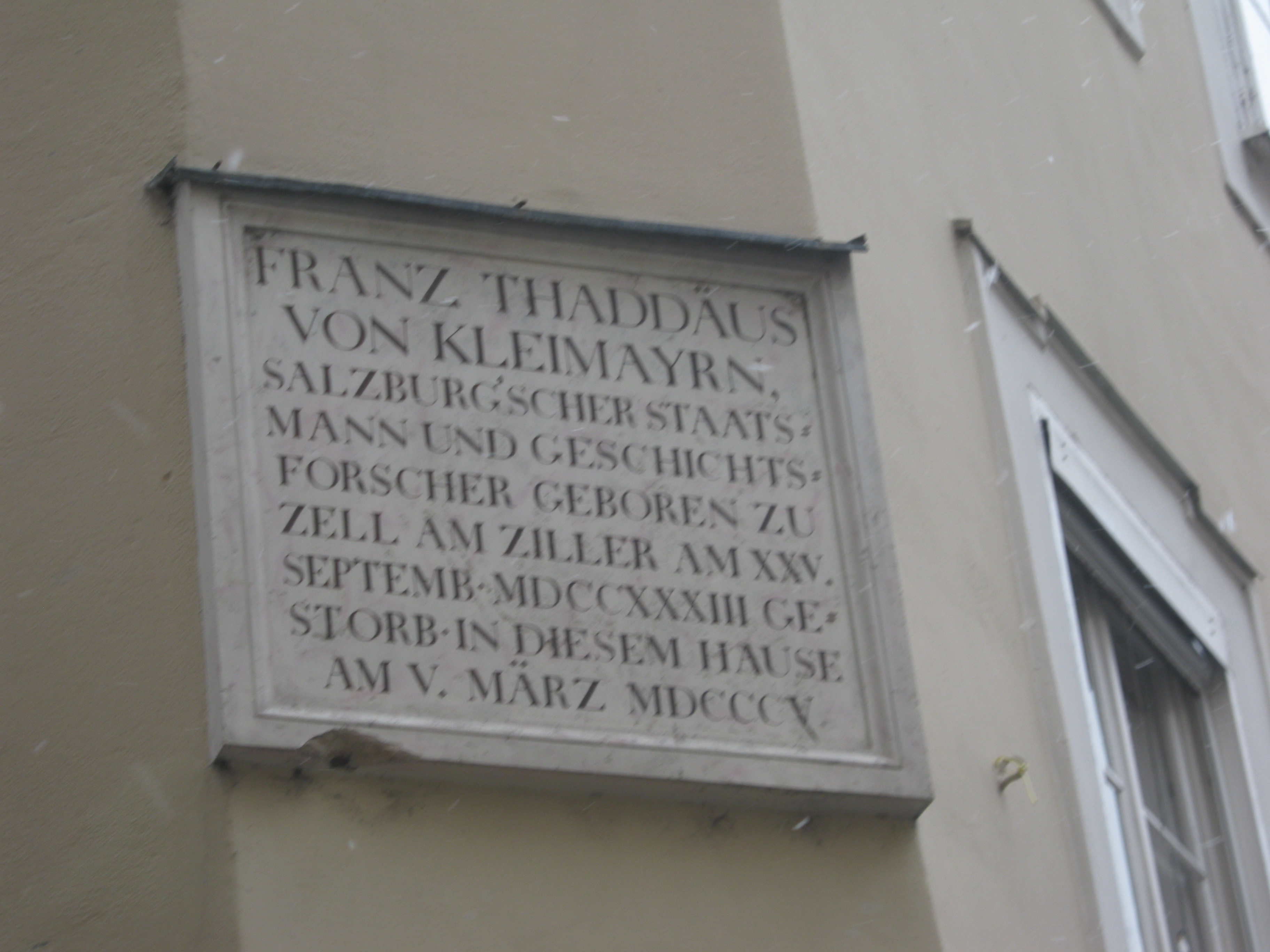 | 21:09, 12. Mär. 2010 | Gedenktafel Kleimayrn.JPG (Datei) | 1,5 MB | {{Bildbeschreibung2 |Beschreibung = Gedenktafel für Franz T. Kleimayrn |Quelle = Andrea Loidl |Fotograf = Andrea Loidl |Erstelldatum = 11.03. 2010 |Lizenzkommentar = }} | 1 | |