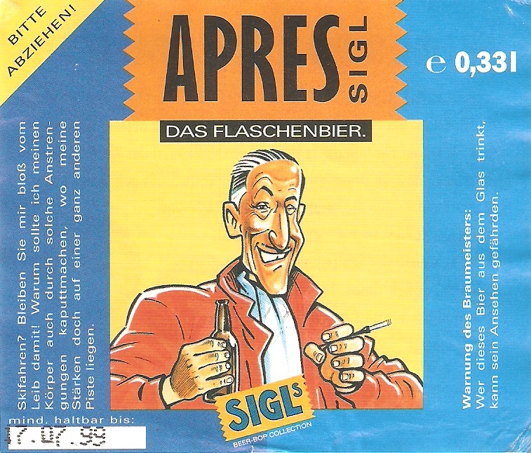| 23:03, 31. Jul. 2016 | Apres Sigl.jpg (Datei) | 262 KB | {{Bildbeschreibung2 |Beschreibung = SIGLs Beer-Bop Collection |Quelle = Trumer Privatbrauerei |Fotograf = |Erstelldatum = |Lizenzkommentar = siehe unten }} | 1 | |