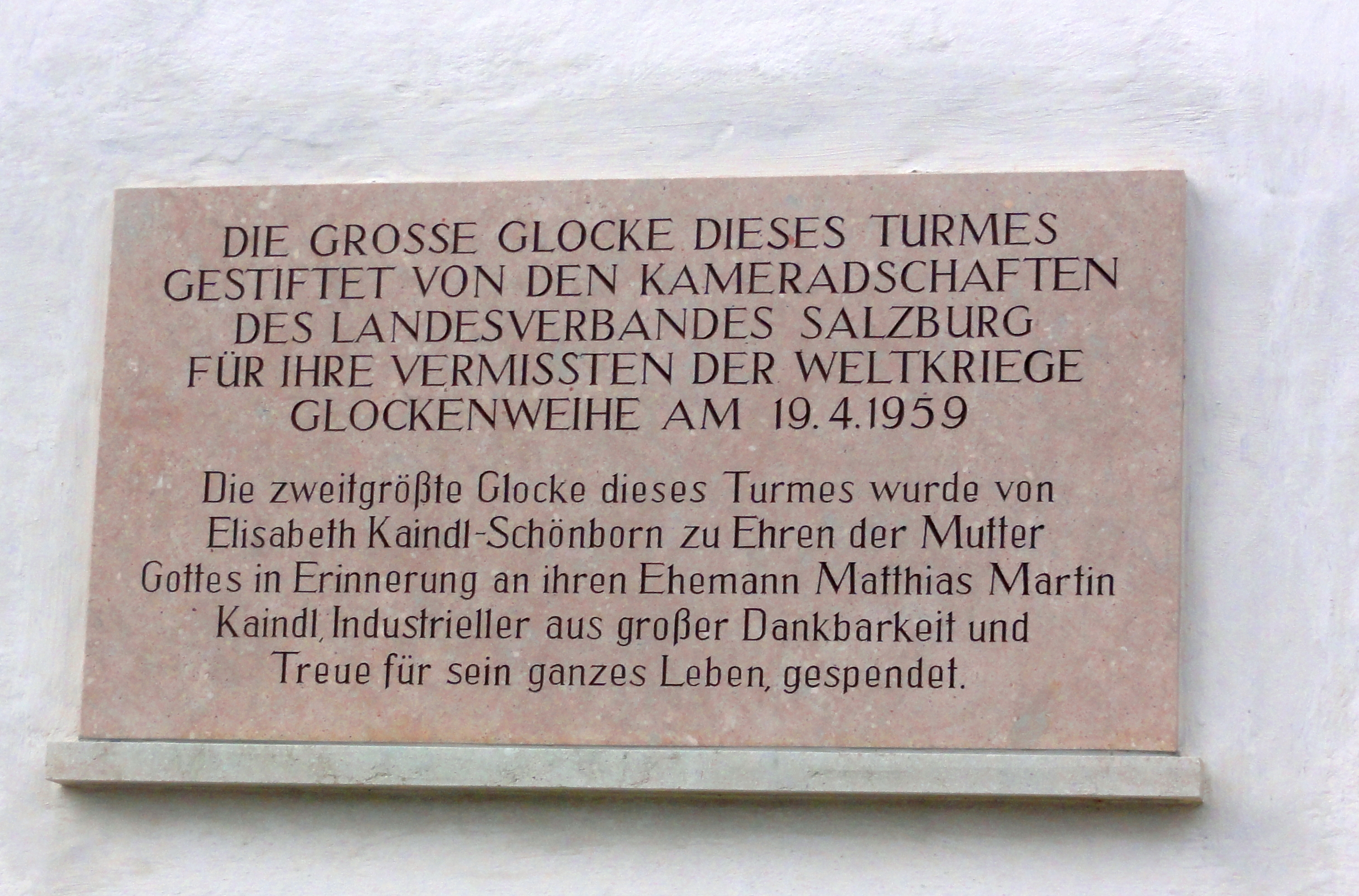 | 18:59, 2. Okt. 2023 | 2023-10-01 Maria Plain Friedenswallfahrt.jpg (Datei) | 1,31 MB | {{Bildbeschreibung2 |Beschreibung = Enthüllung des neuen Ehrenmals des Salzburger Kameradschaftsbundes in Maria Plain |Quelle = Albert Moser, Seekirchen |Fotograf = Albert Moser |Erstelldatum = 1.10.2023 |Lizenzkommentar = Verwendung im Salzburgwiki wurde vom Urheber freudlich genehmigt }} Kategorie:Datei:Johann Weyringer {{Kategorie:Datei:Sazburger Kameradschaftsbund]] | 1 | |