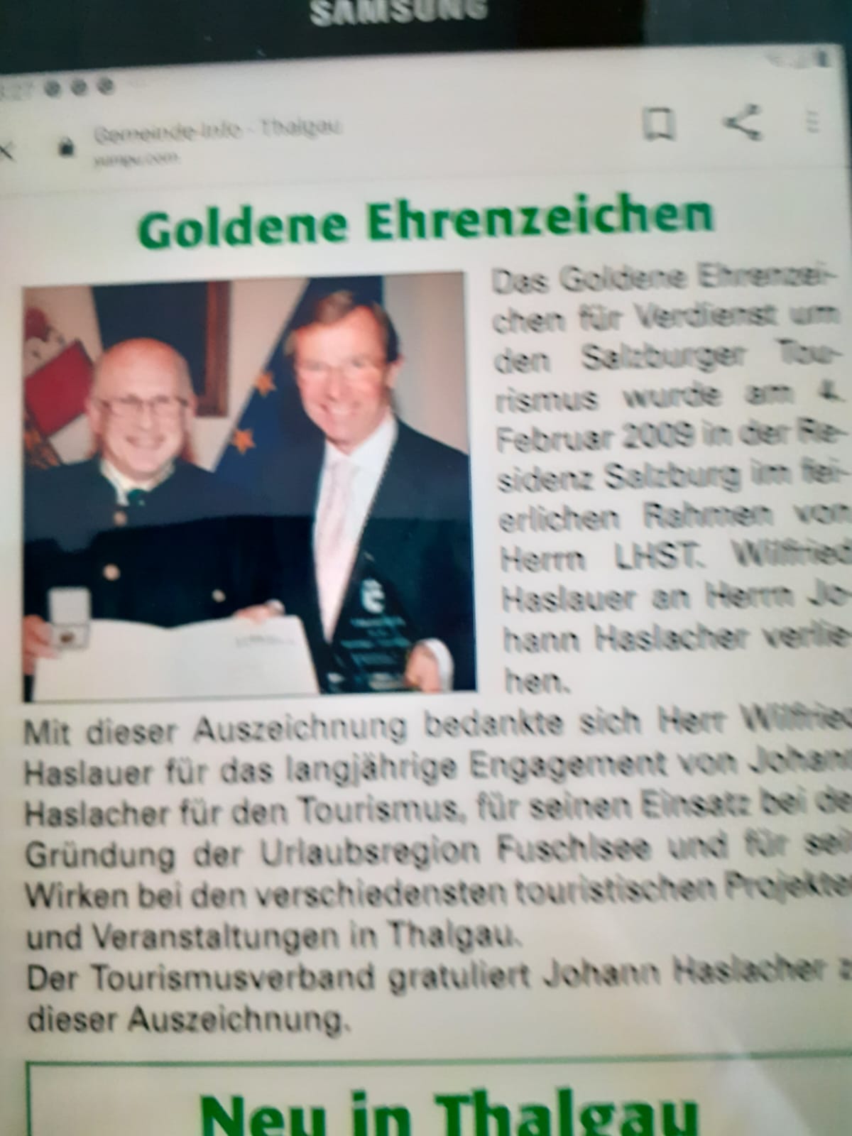 | 17:20, 29. Sep. 2023 | IMG-20230929-WA0002.jpg (Datei) | 131 KB | {{Bildbeschreibung2 |Beschreibung = Haslacher wurde mit dem Goldenen Ehrenzeichen für den Salzburger Tourismus geehrt. |Quelle = Thalgauer Gemeindezeitung |Fotograf = -- |Erstelldatum = 2023 |Lizenzkommentar = }} Kategorie:Datei:Johann Haslacher | 1 | |