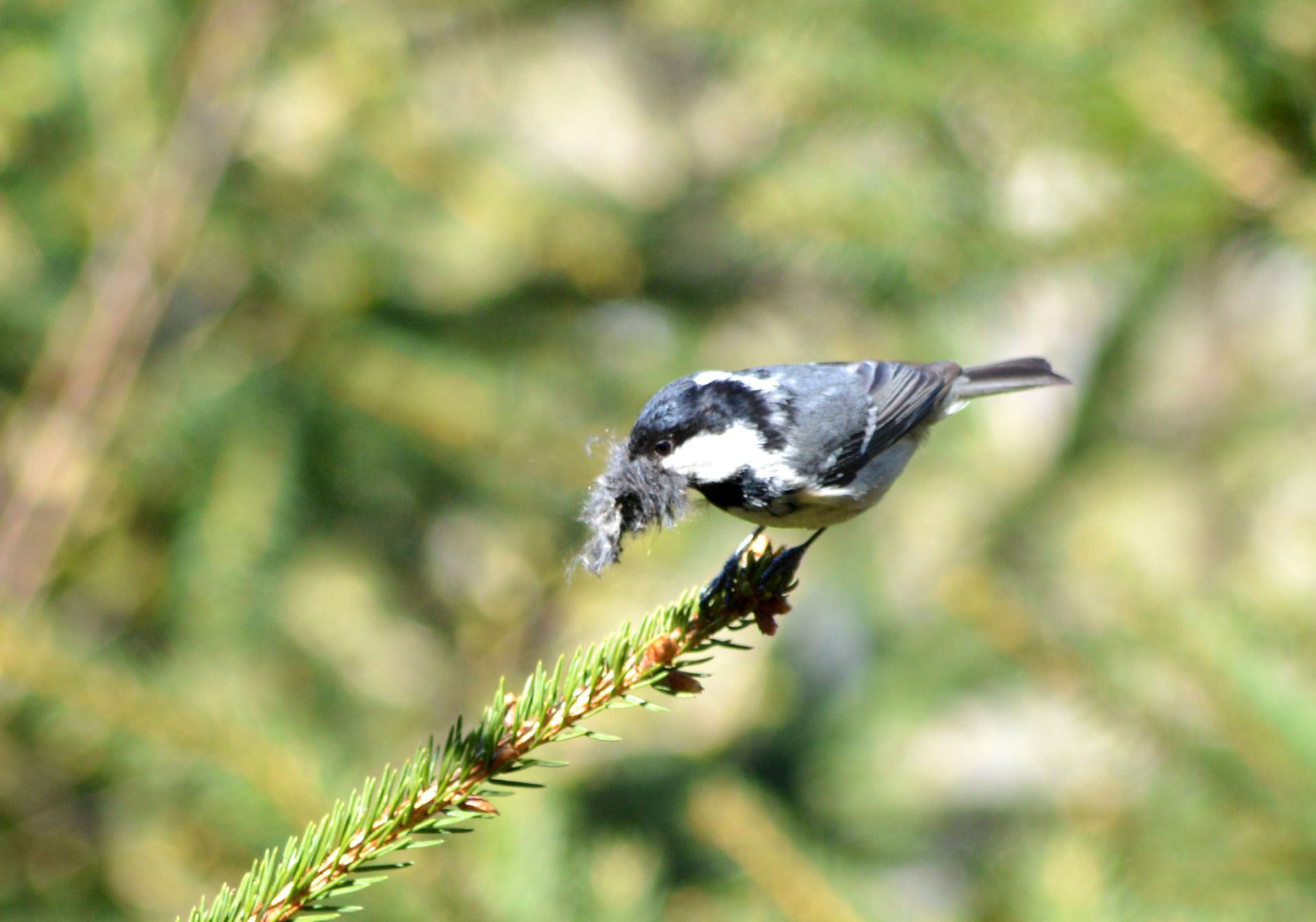 Tannenmeise mit Nistmaterial