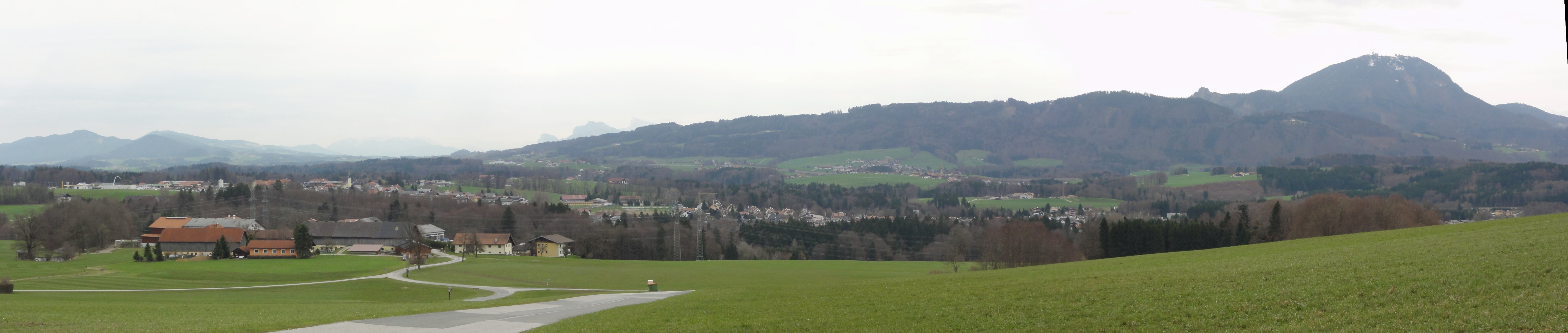 - Panoramaaufnahme nach Osten, Blick auf Moosham (vorne) und Elixhausen (Bildmitte); Standort: Voggenberg