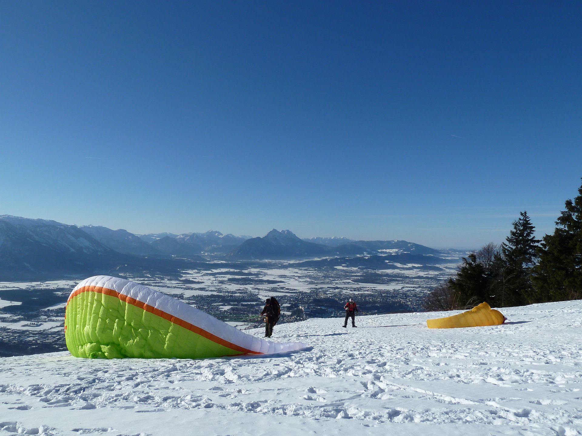 Am Gaisberg starten an einem Traumtag wie dem 5. Jänner 2011 hoch über der Stadt Salzburg Gleitschirmfliegende. Blick ins Salzburger Becken und im Hintergrund das Staufengebirge, Teilgebirge der Chiemgauer Alpen.