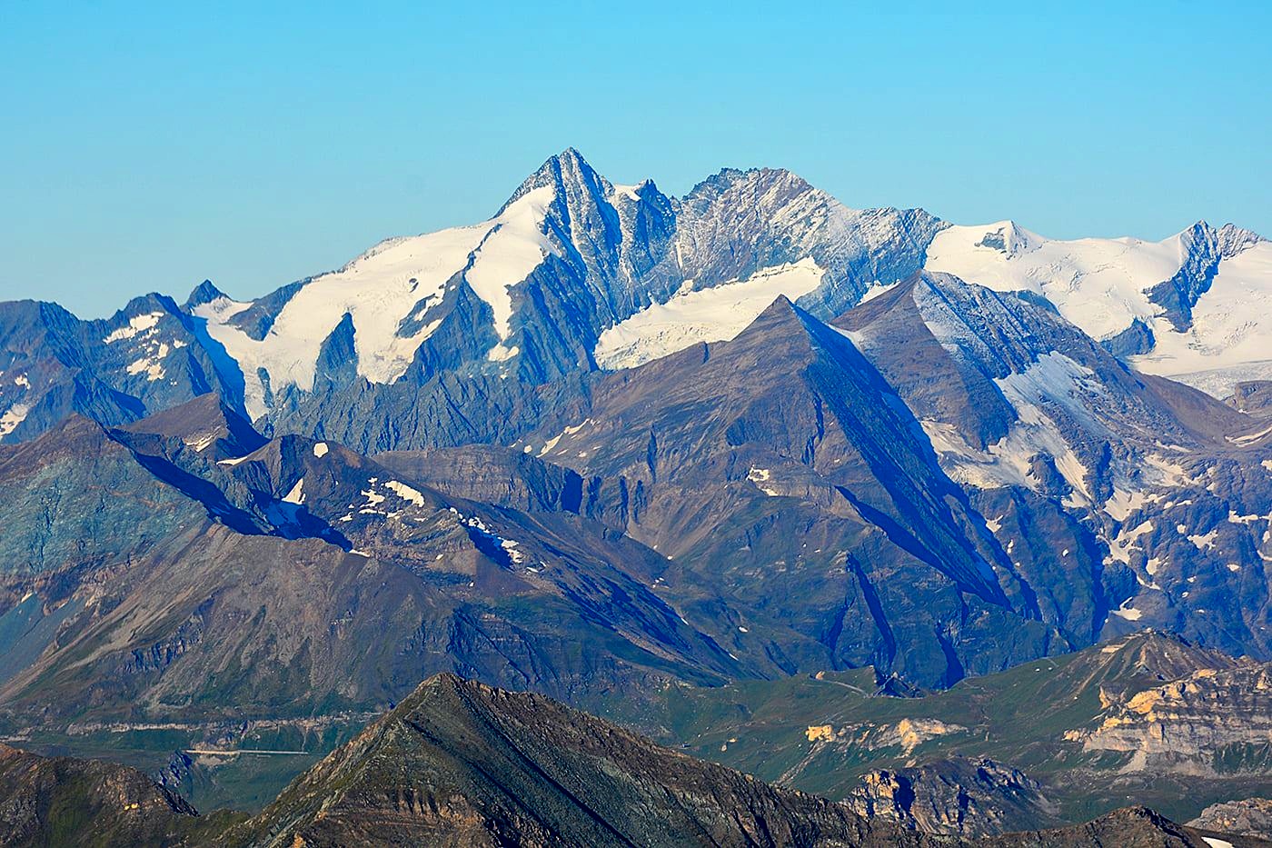 - Großglockner-Gipfelregion und die Großglockner Hochalpenstraße am unteren Bildrand: von links kommt die Straße Hochtor und im rechten Teil erkennt man das Fuscher Törl sowie ganz rechts die Edelweißspitze.