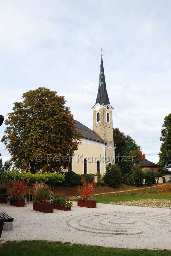 - Pfarrer-Schwab-Park im Kirchenbezirk von Neumarkt am Wallersee: Labyrinth und Blick gegen die Stadtpfarrkirche zum heiligen Nikolaus, dazwischen erhebt sich der Schanzwallweg