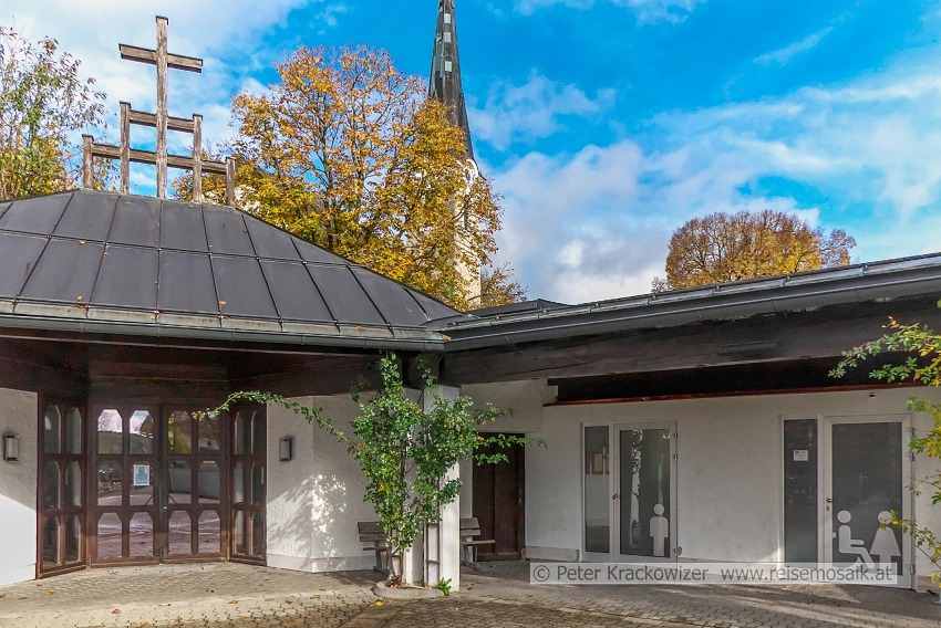 - Kirchenbezirk von Neumarkt am Wallersee: von links Aussegnungshalle , daneben den Pfarrer-Schwab-Park und dahinter die Volksschule