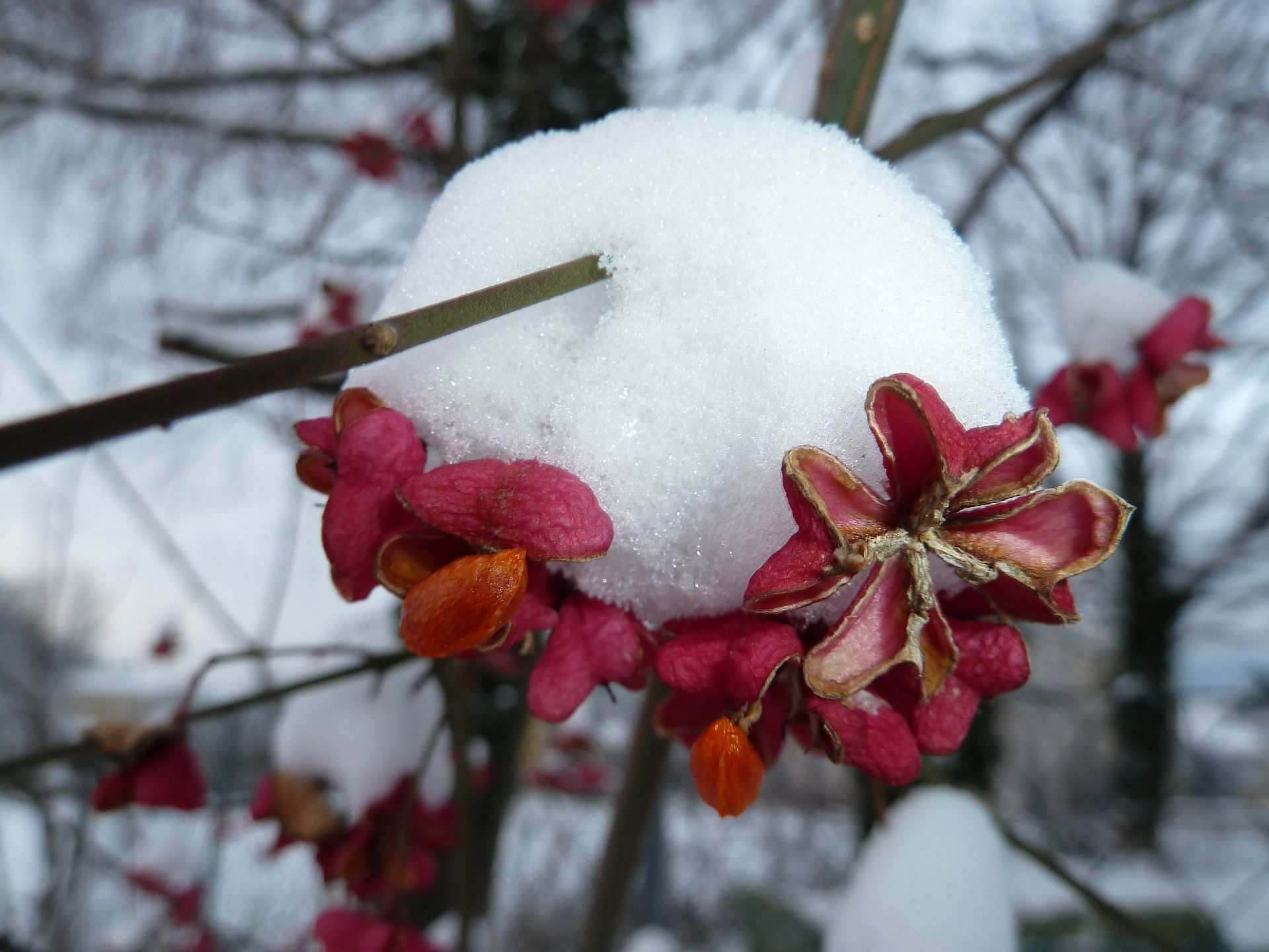 Die aufgesprungenen Früchte des Pfaffenkäppchens überdauern am Baum oder Strauch hängend oft den Winter.