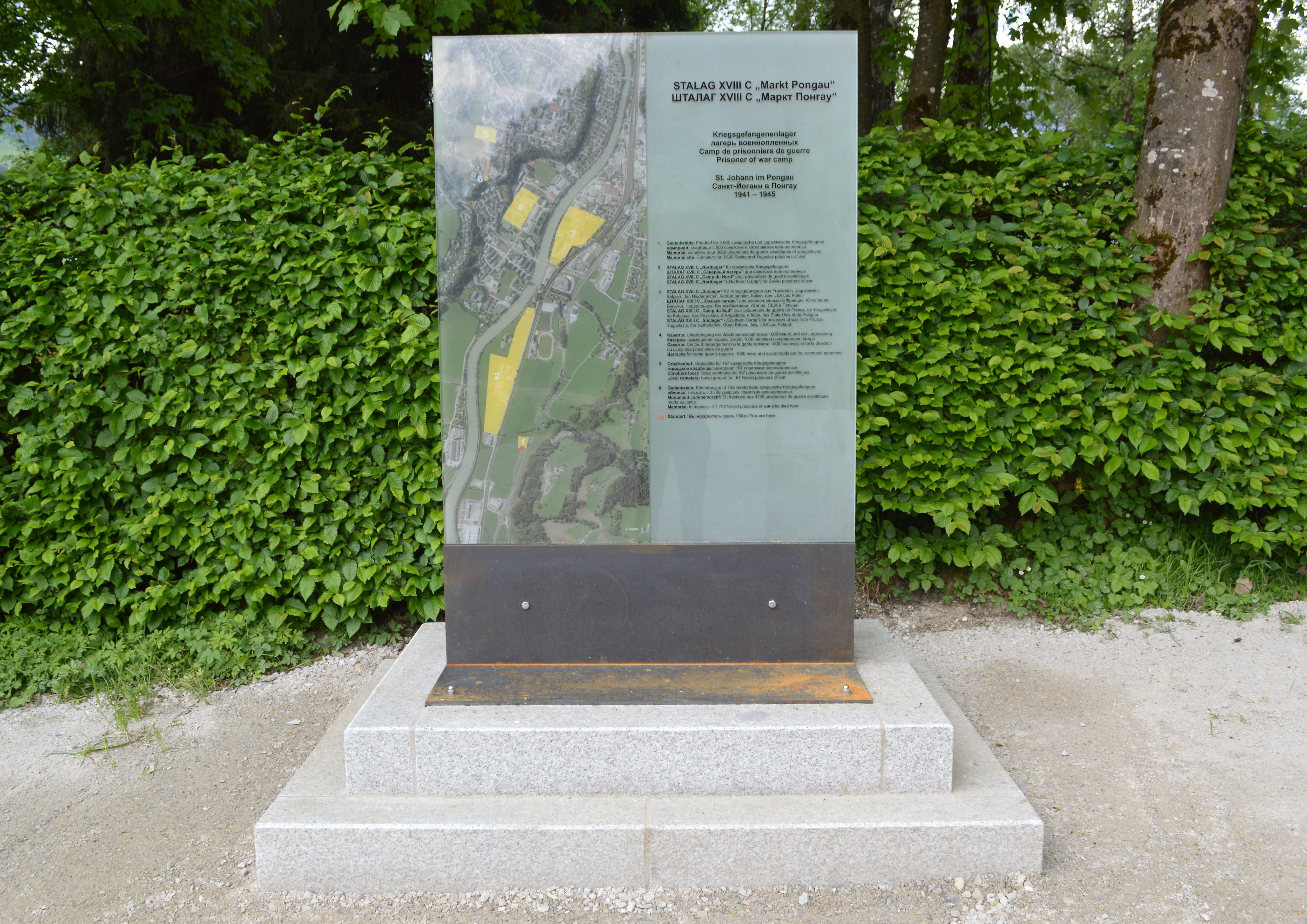- Diese Glasstele des Künstlers Karl Hartwig Kaltner steht links vom Eingangstor zum Russenfriedhof (Sankt Johann im Pongau) und zeigt den Lageplan der einzelnen Lager des ehemaligen Stalags in St. Johann im Pongau.