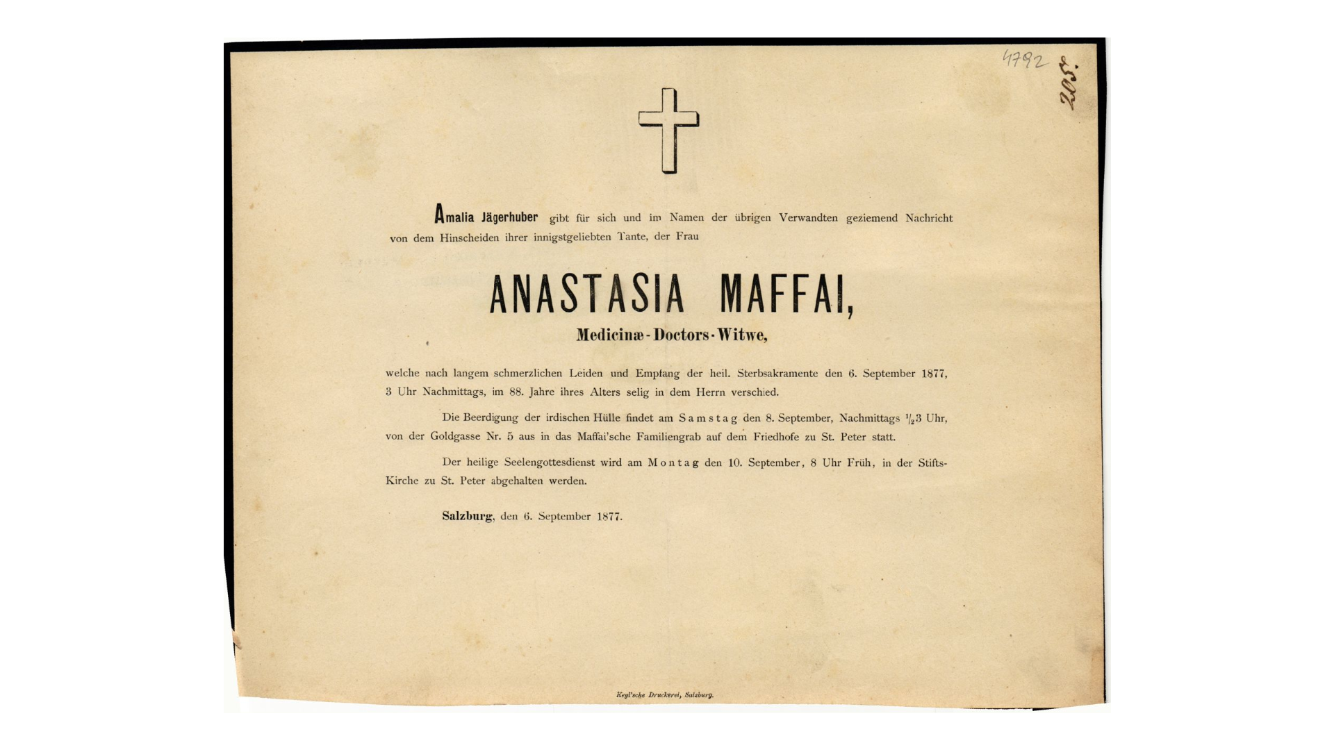 - Partezettel von Anastasia Maffei vom 6. September 1877, gedruckt in der Duyle'schen Buchdruckerei.