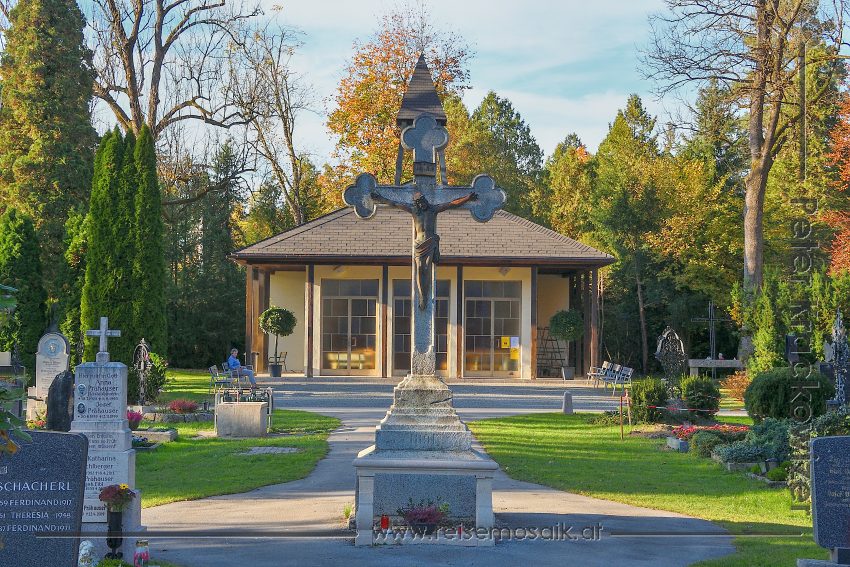 - Kreuz am Aigner Friedhof, im Hintergrund die Aufbahrungshalle.
