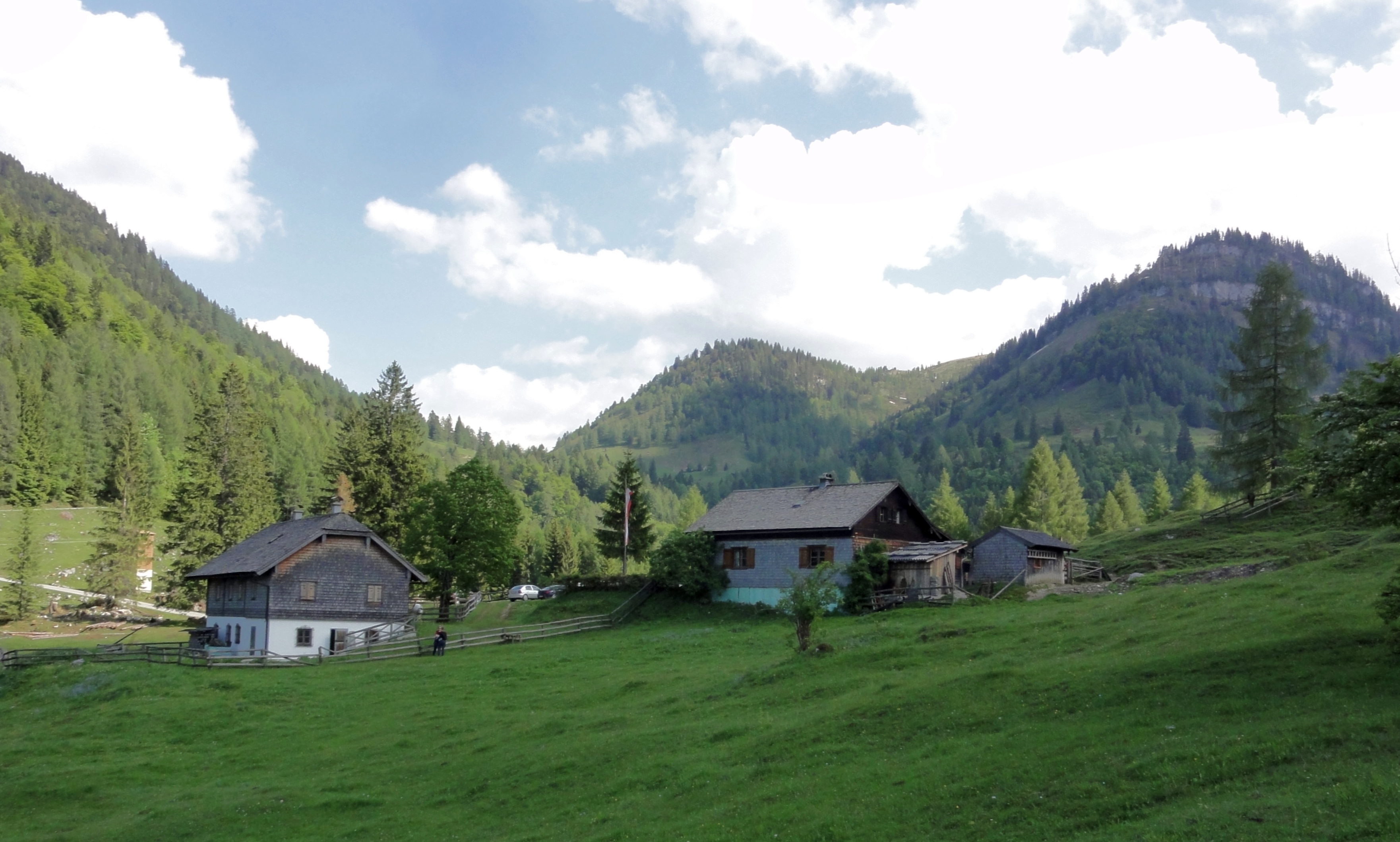 - Schwarzeneckalm in Strobl am Wolfgangsee, nördliche Ansicht; von hier führt die Bleckwandstraße links weiter noch oben zu den Niedergadenalmen.
