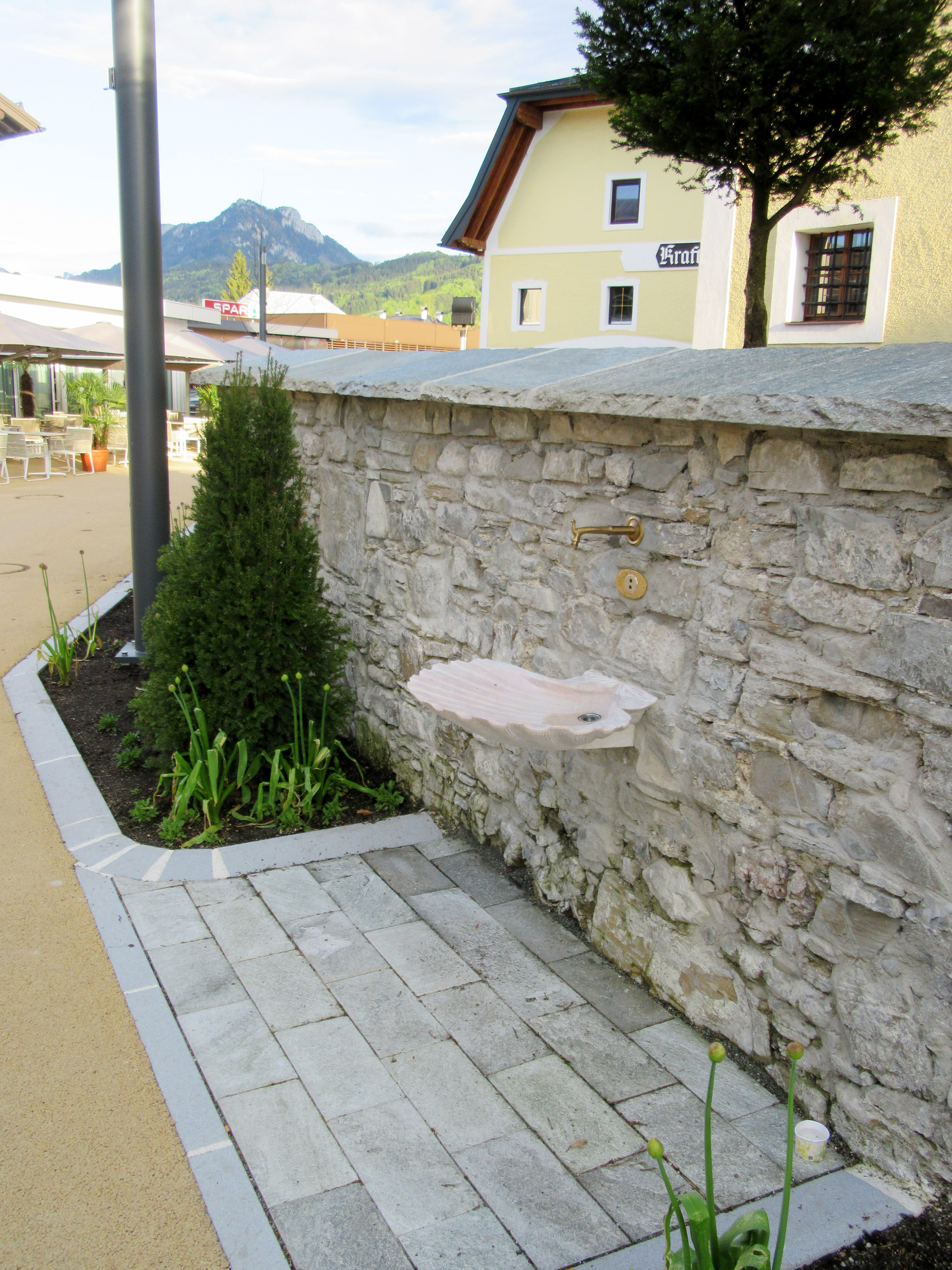 - Trinkwasserbrunnen mit Sensor an der Friedhofsmauer im Zentrum von Thalgau.