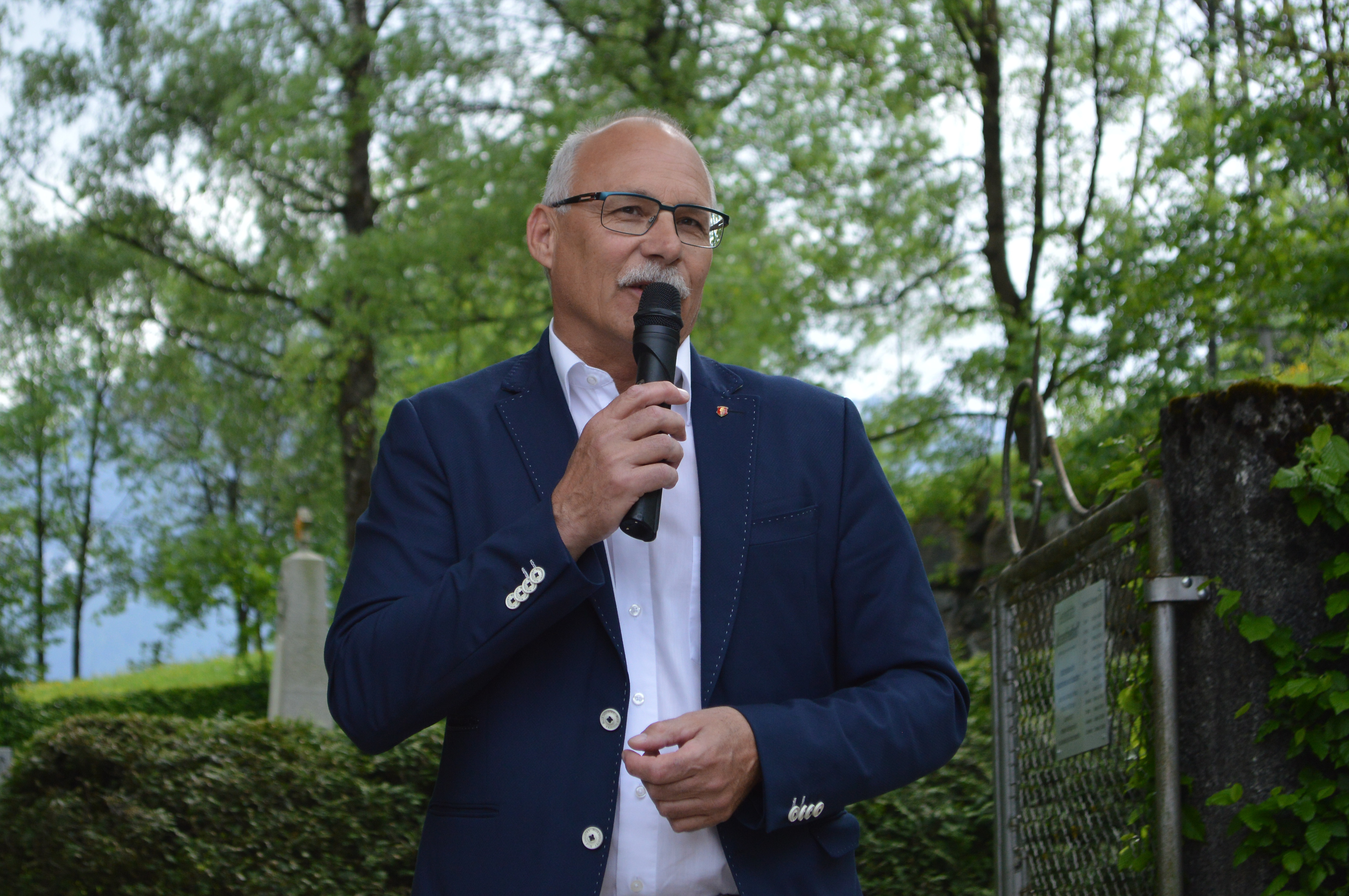 - Bürgermeister Günther Mitterer, Gemeinde St. Johann im Pongau bei seiner Ansprache anlässlich der feierlichen Enthüllung der Gedenkstelen vor dem Russenfriedhof (Sankt Johann im Pongau
