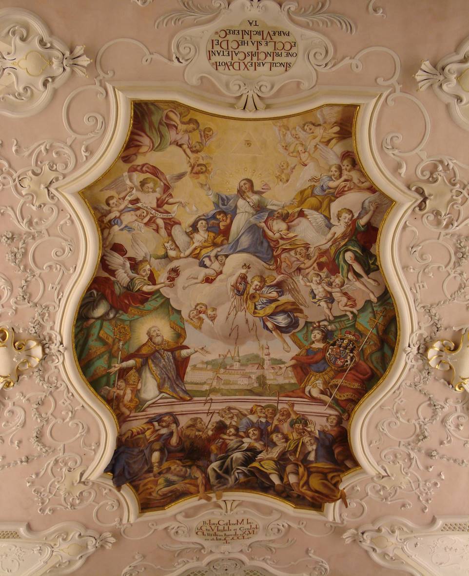 - Wallfahrtskirche Maria Kunterweg in Ramsau bei Berchtesgaden. Deckengemälde „Verdammung der Lutherischen“. Aus dem Himmel gehen Blitze auf die Protestanten nieder und schlagen u.a. in die Lutherbibel ein. Der heilige Augustinus (links) dankt dem Himmel dafür. Im Hintergrund der Markt Berchtesgaden. Das Bild ist eine Rechtfertigung für die Vertreibung der Protestanten, die in der Zeit erfolgte, als auch die Kirche erbaut wurde.