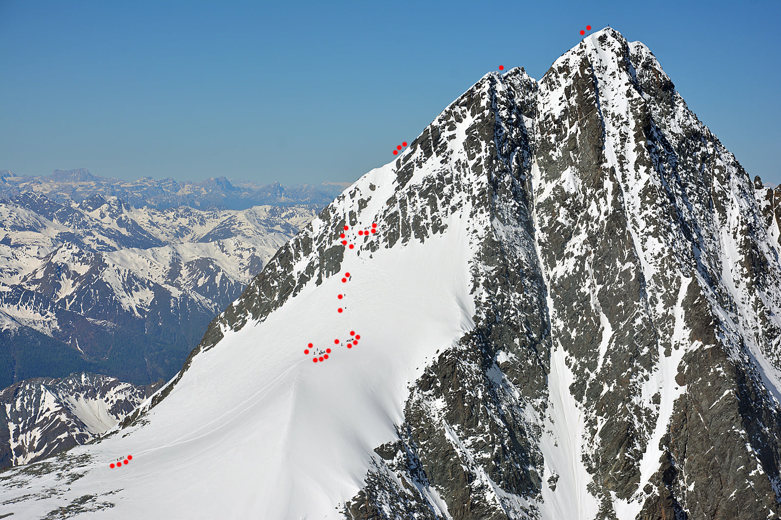 - Der Großglockner von Südosten. Die roten Punkte markieren Bergsteiger, die auf dem Weg zum Kleinglockner (linker zweiteiliger Gipfel) und Großglockner (rechter Gipfel) unterwegs waren.