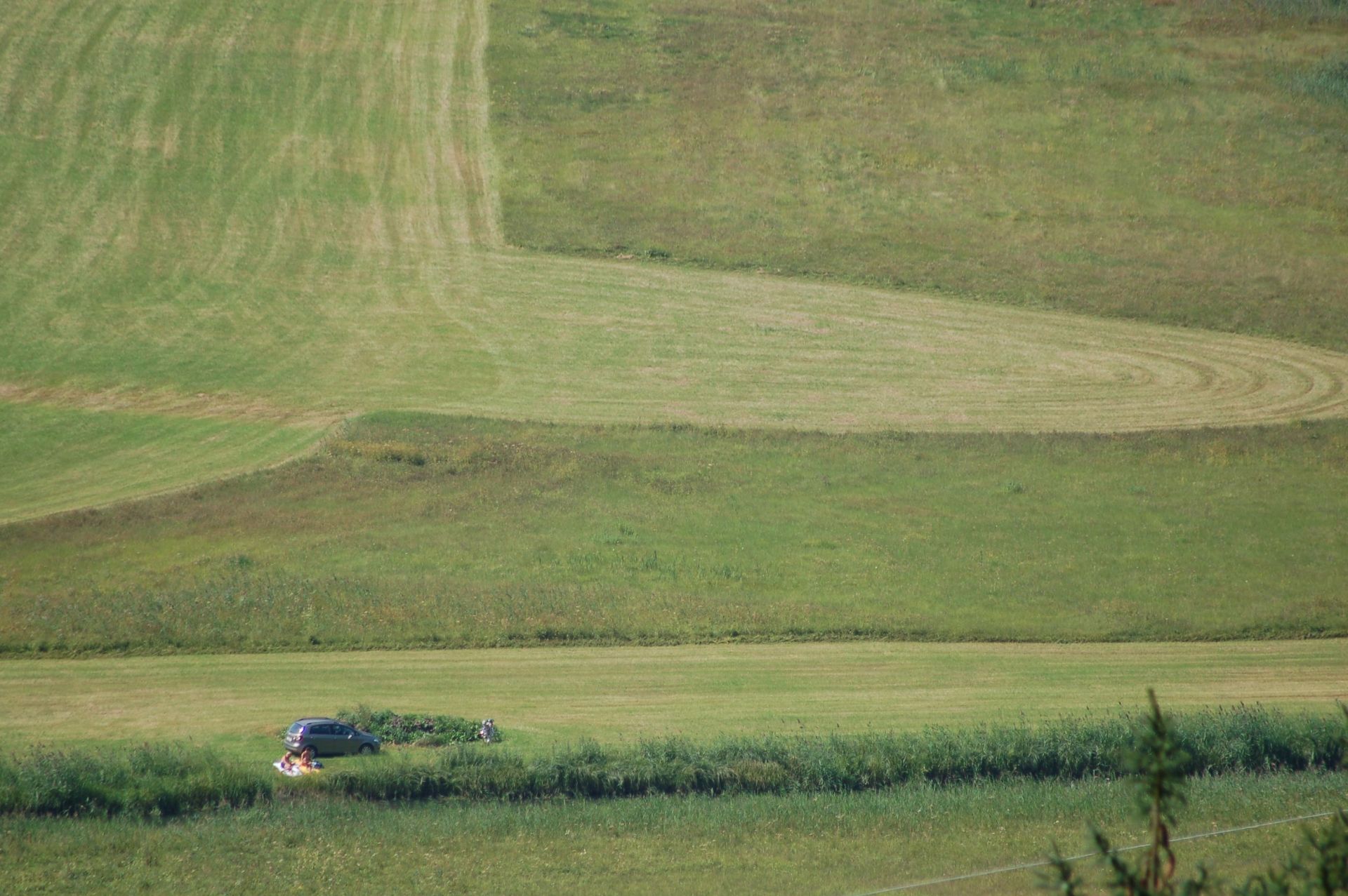 Wege im Naturschutzgebiet Zeller See. Die Aufnahme vom Erlberg zeigt ein über den Wirtschaftsweg zugefahrenes und am Großen Seekanal parkendes Auto und daneben zwei Menschen, die hier das Ufer des Großen Seekanals nach vorhergehendem Baden im Großen Seekanal zum Sonnen nutzen.