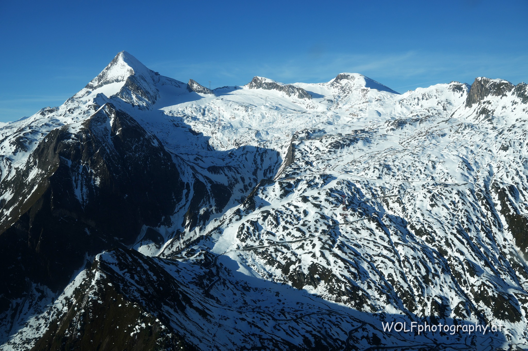 - Kitzsteinhorn (links) und darunter rechts das Schmiedingerkees mit dem Gletscherskigebiet Kitzsteinhorn.
