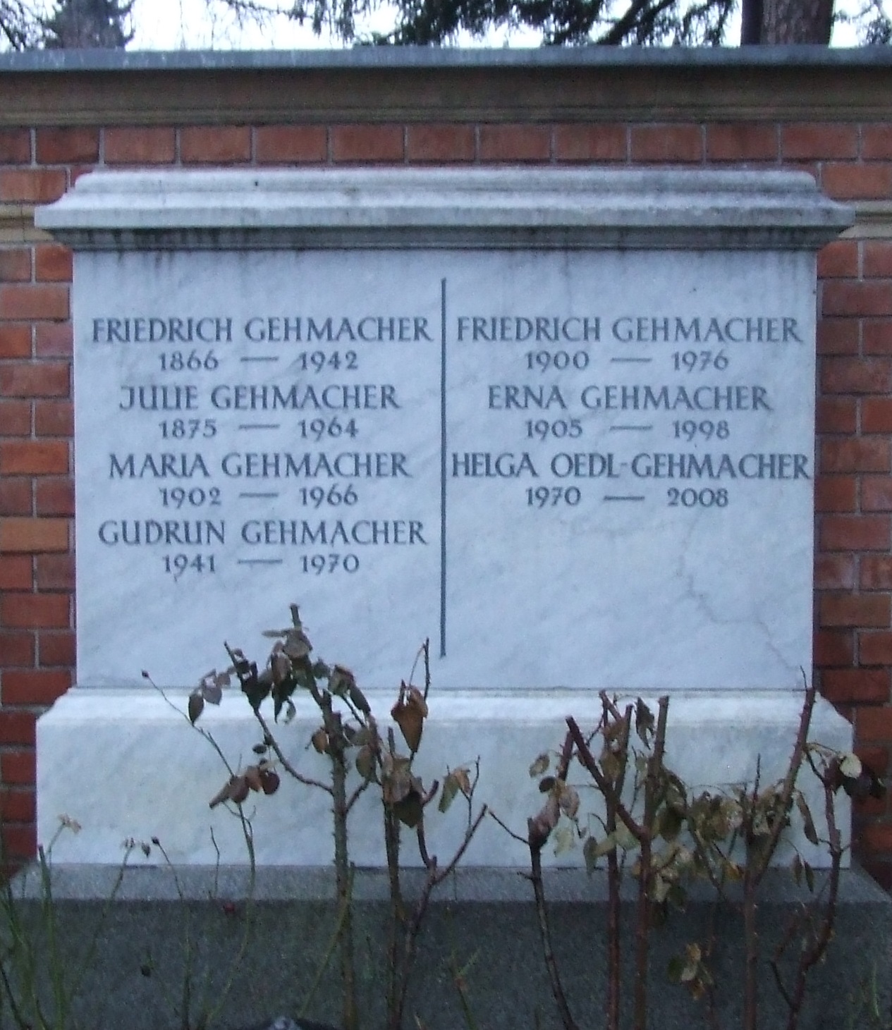 | 23:34, 12. Jan. 2015 | Grab Friedrich Gehmacher.JPG (Datei) | 477 KB | {{Bildbeschreibung2 |Beschreibung = Grab der Familie Friedrich Gehmacher auf dem Salzburger Kommunalfriedhof |Quelle = |Fotograf = Karl Irresberger |Erstelldatum = Februar 2012 |Lizenzkommentar = }} {{Bild/GNU}} … | 1 | |