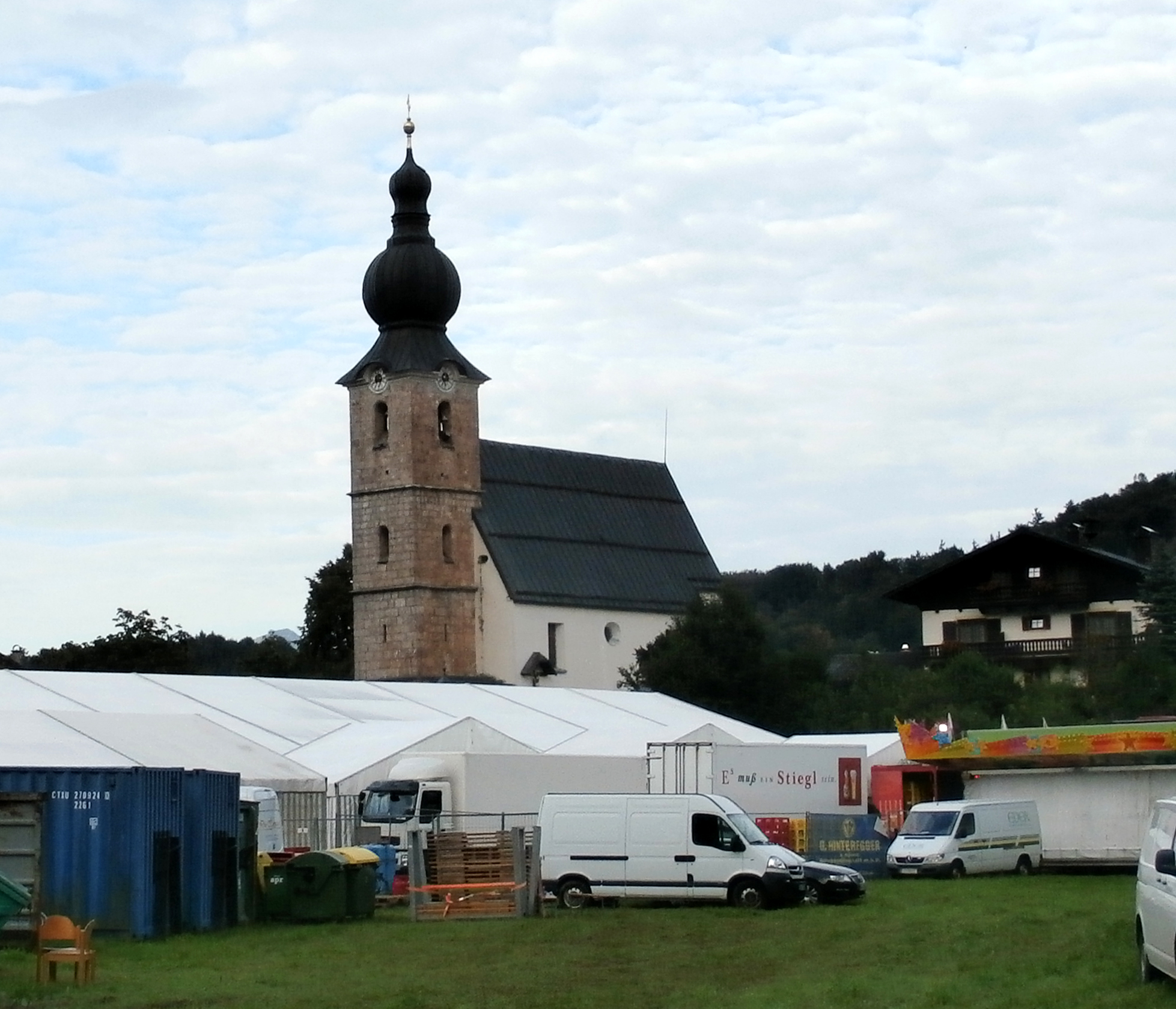 - Wallfahrtskirche St. Leonhard, Südansicht, mit Zelt vom St. Leonharder Kirtag