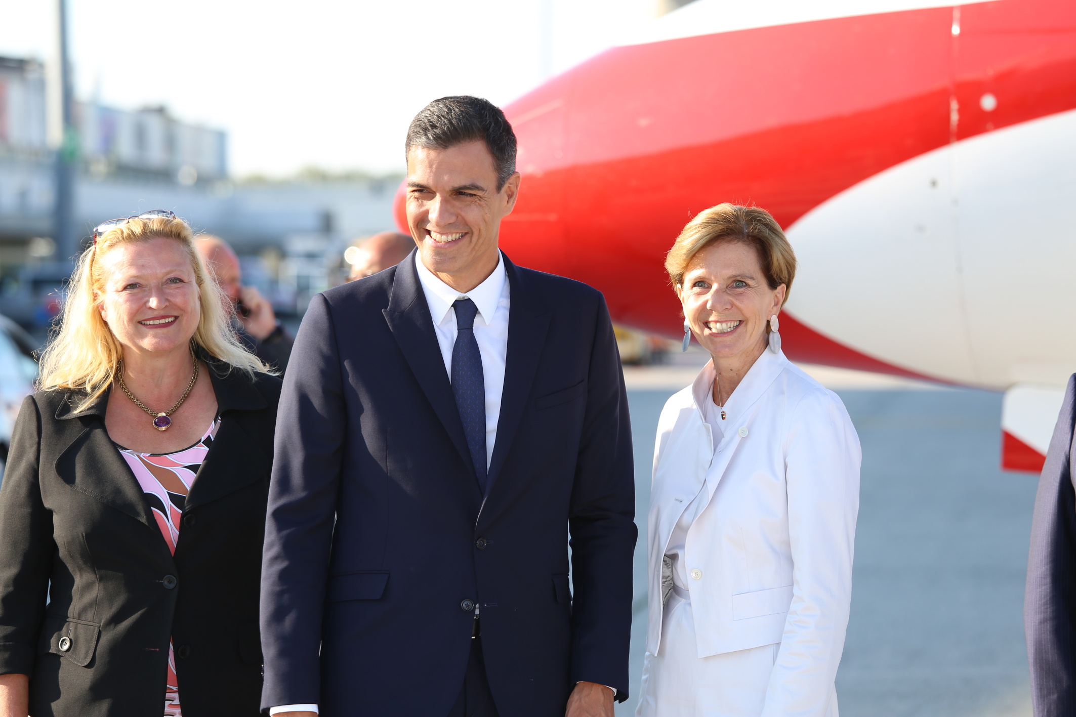 - EU-Gipfeltreffen 2018 in Salzburg: Ankunft des Ministerpräsidenten von Spanien Pedro Sánchez (Bildmitte) am Flughafen Salzburg. Im Bild beim Empfang durch Landtagspräsidentin Brigitta Pallauf (rechts) und Bettina Ganghofer (links), Geschäftsführerin der Salzburger Flughafen GmbH
