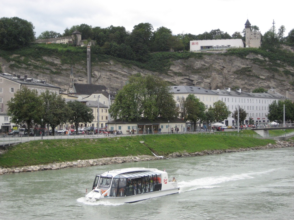 Das Salzachschiff Amadeus im Bereich des Hanuschplatzes. Im Hintergrund der Mönchsberg mit dem Museum der Moderne.