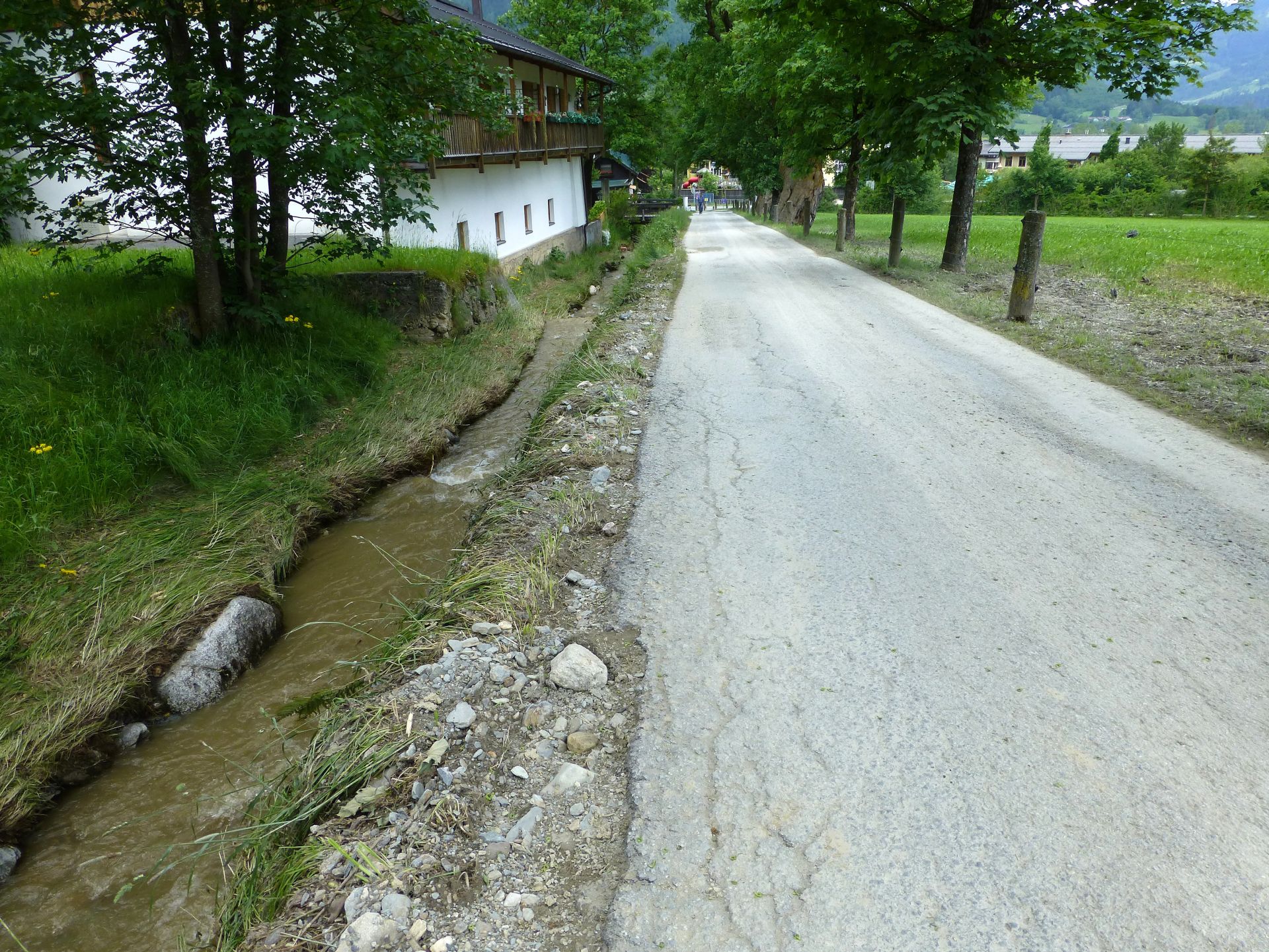 Der Schüttbach, eingezwängt zwischen Straße und einer Reihe von Häusern, die nur durch ihre Grundmauern vom Bachbett getrennt sind.