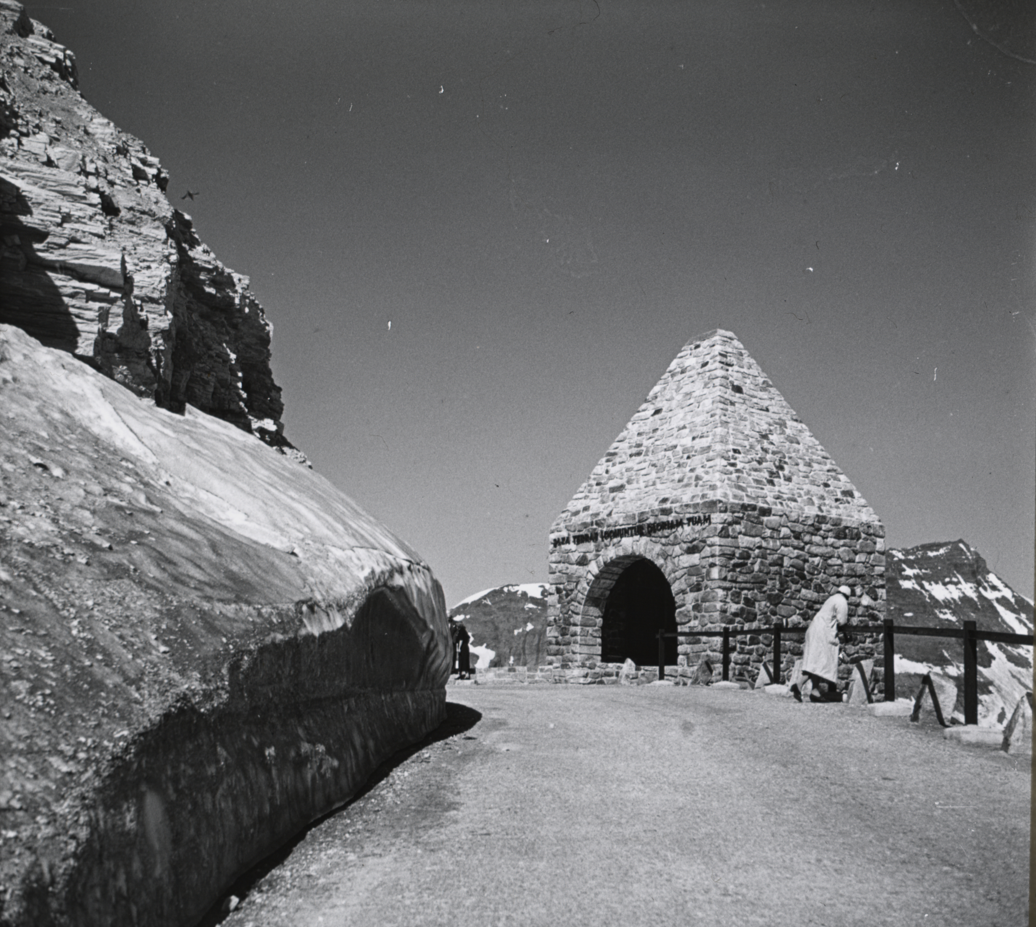 - Blick zum Gedenkzeichen Fuscher Törl an Großglockner Hochalpenstraße mit Eleonore (Lore) Helene Bertolini (* 1906; † 1995). Teil einer Stereoskopie auf Glasplatte (Positiv) schwarz-weiß quer.