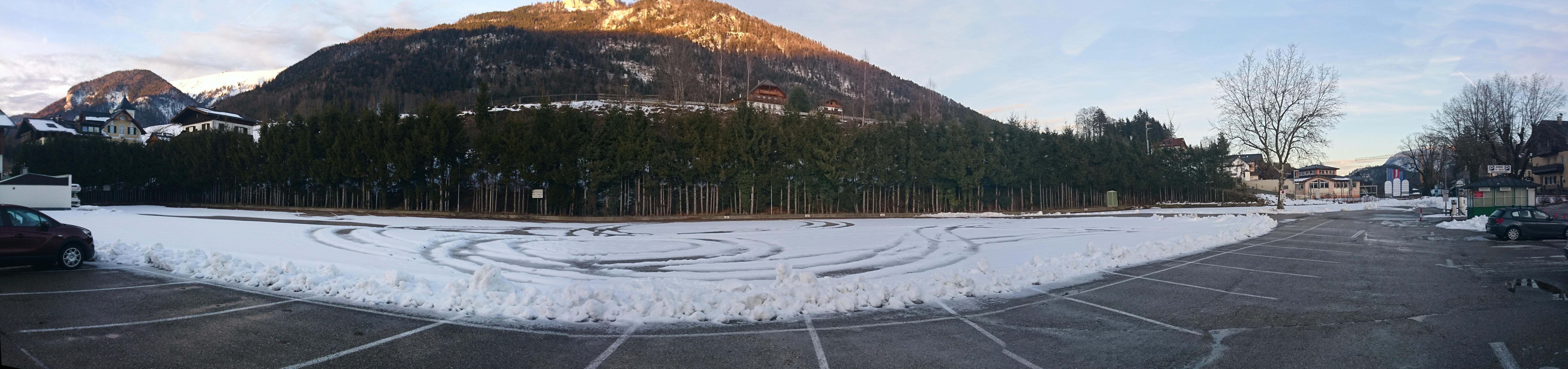 - der leere Parkplatz in St. Wolfgang in der Coronazeit Jänner 2022, hier standen bis öfters zu 30 Busse