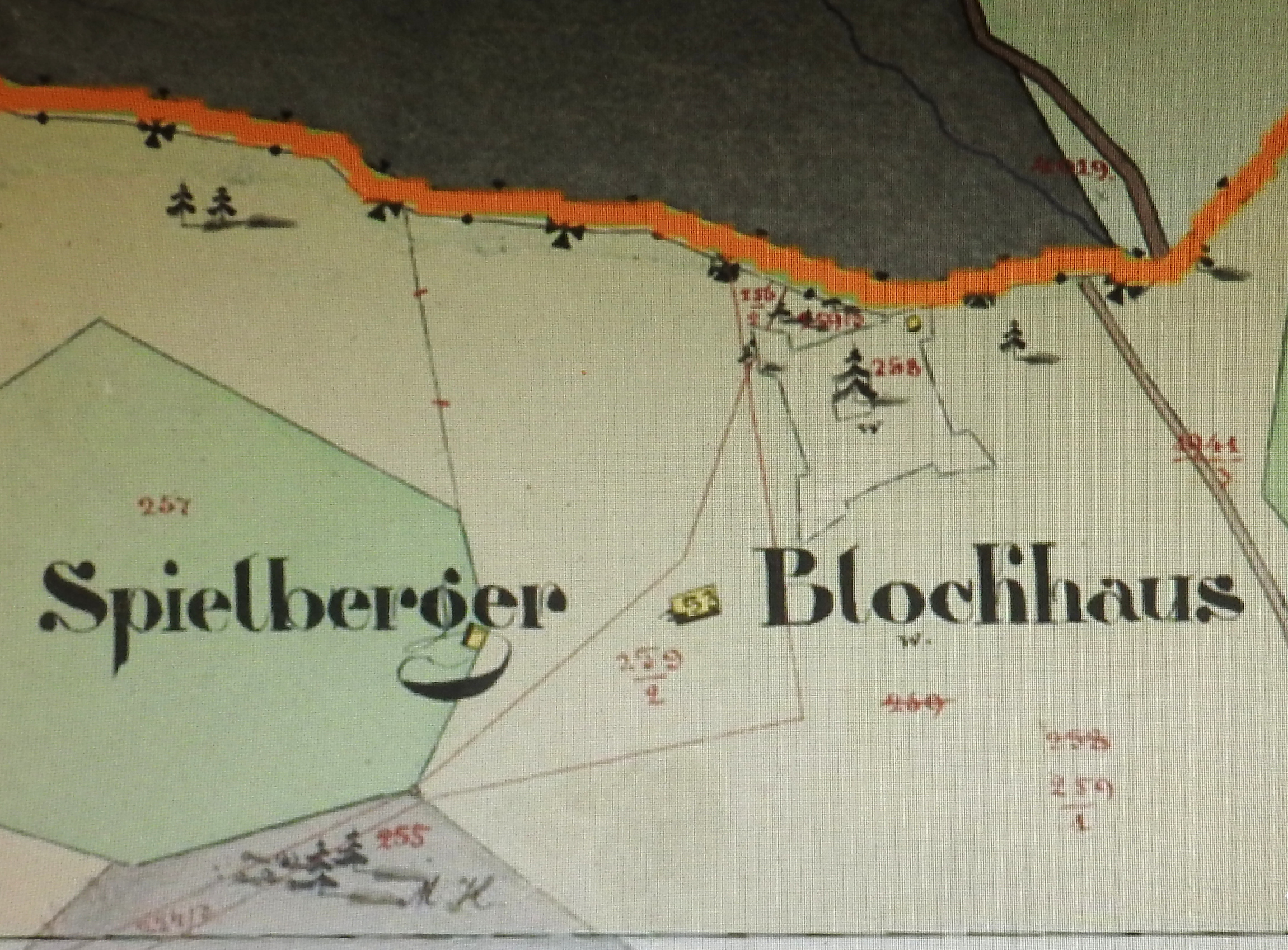 - Das Bild zeigt einen Ausschnitt aus dem Franziszäischen Kataster von 1830 mit Spielbergschanze und Blockhaus in Saalbach-Hinterglemm an der Grenze zwischen Salzburg und Tirol.