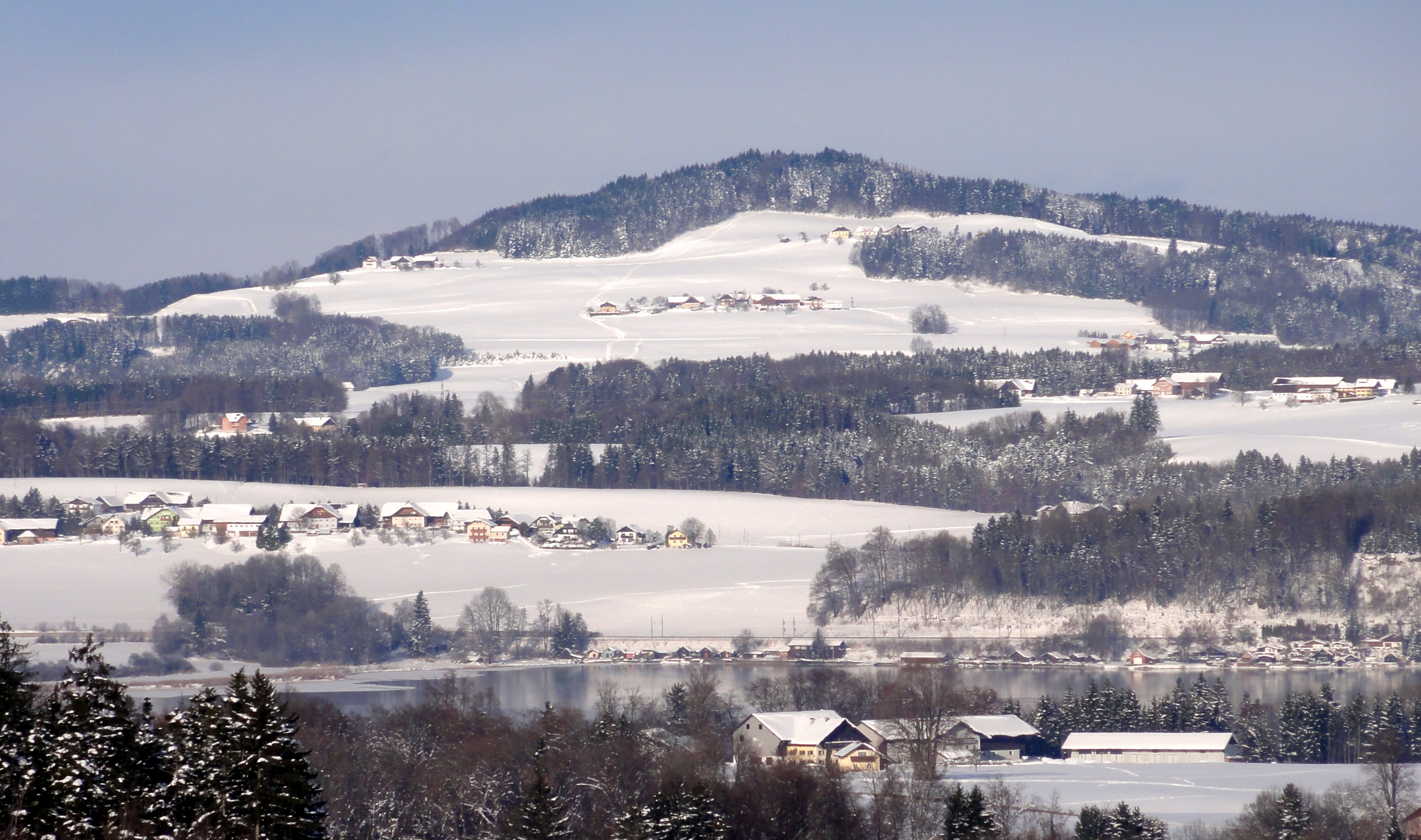 Buchberg, südöstliche Ansicht von Hankham in Henndorf am Wallersee aus Im Vordergrund ist der Wallersee im Gemeindegebiet von Neumarkt am Wallersee sichtbar