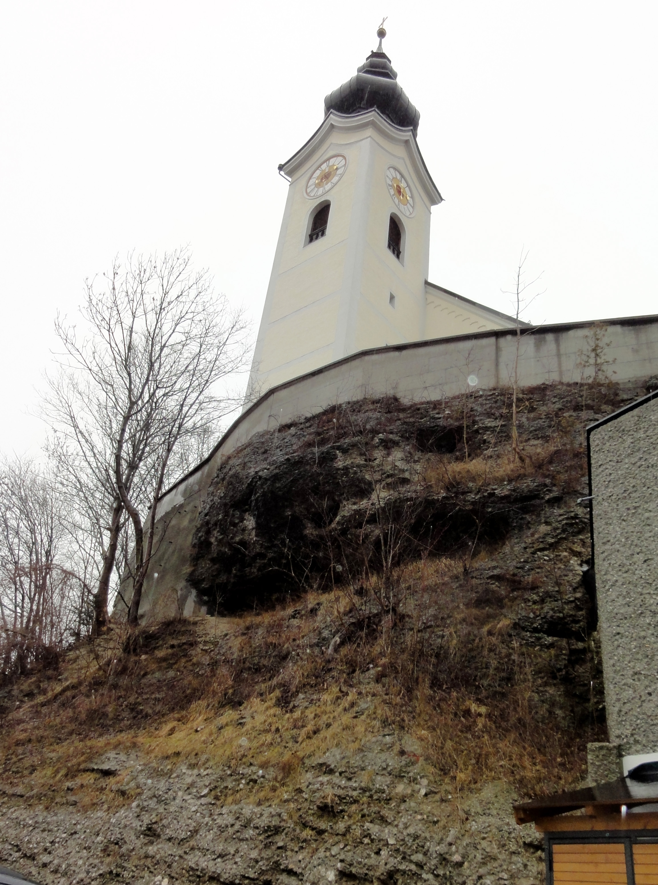 Datei:Walser Pfarrkirche steht auf einem Felsen.jpg