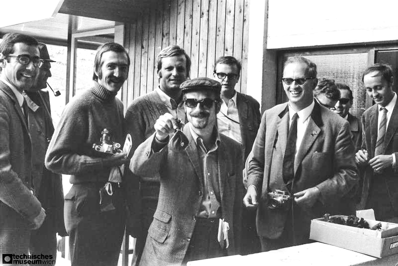 - Eröffnungswochenende des Salzburgrings, Vertreter der Presse erhalten ein Erinnerungsgeschenk, rechts mit Brille Dr. Helmut Krackowizer;