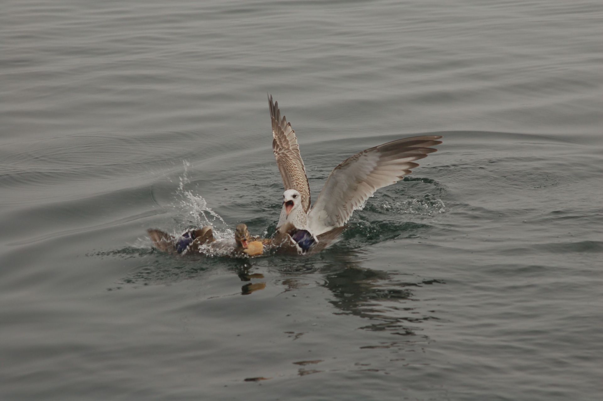 Vogelfütterung. Das Bild zeigt eine ungefähr sieben Monate alte Sturmmöwe im ersten Winter, die auf dem Zeller See einem Stockentenweibchen das Futter abjagt.