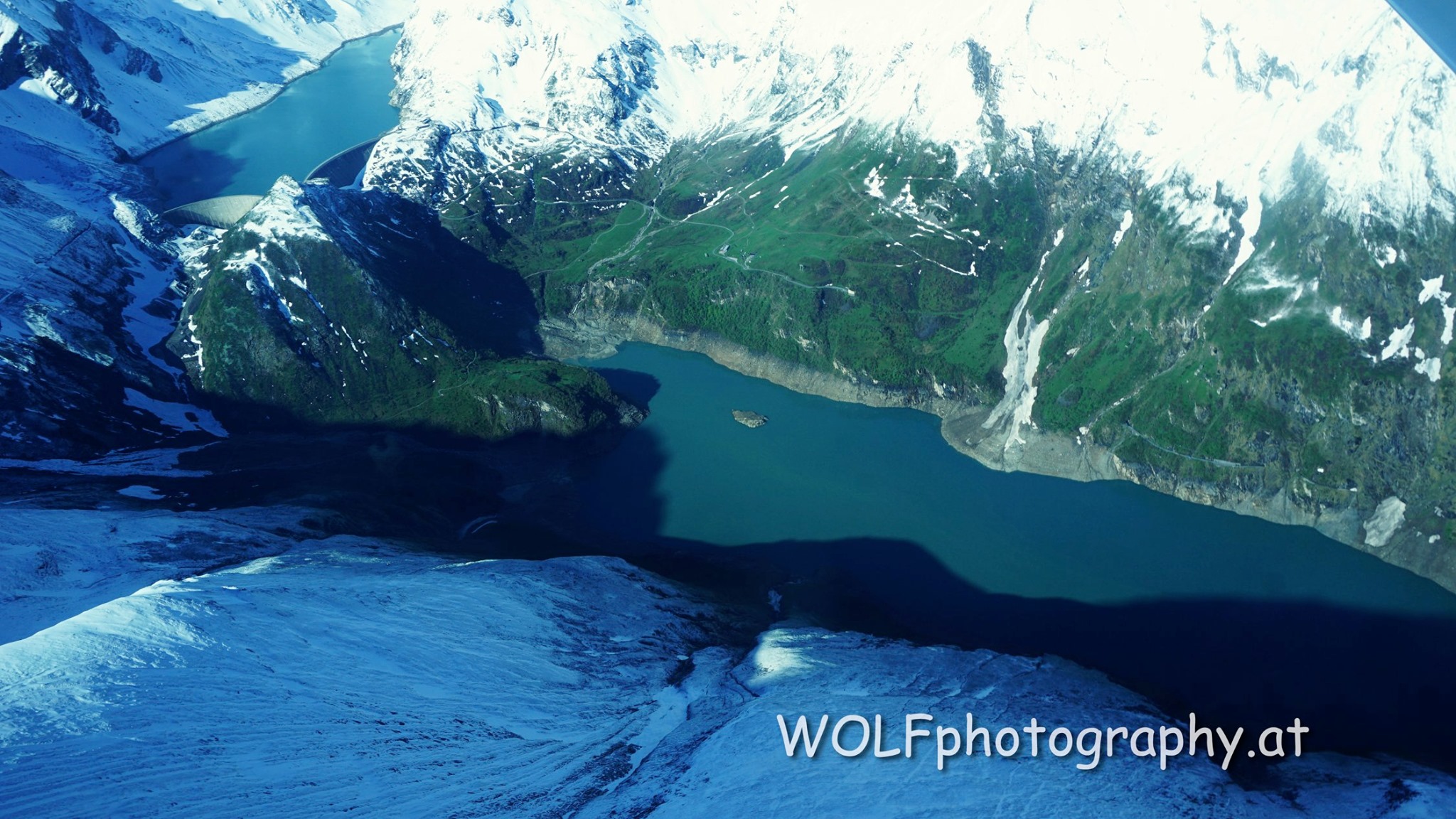 - Flug über die Glocknergruppe zum Großglockner Mai 2020: Tiefblick auf die Tauernkrafwerke-Speicherseen Wasserfallboden (Bildmitte) und Mooserboden (links).