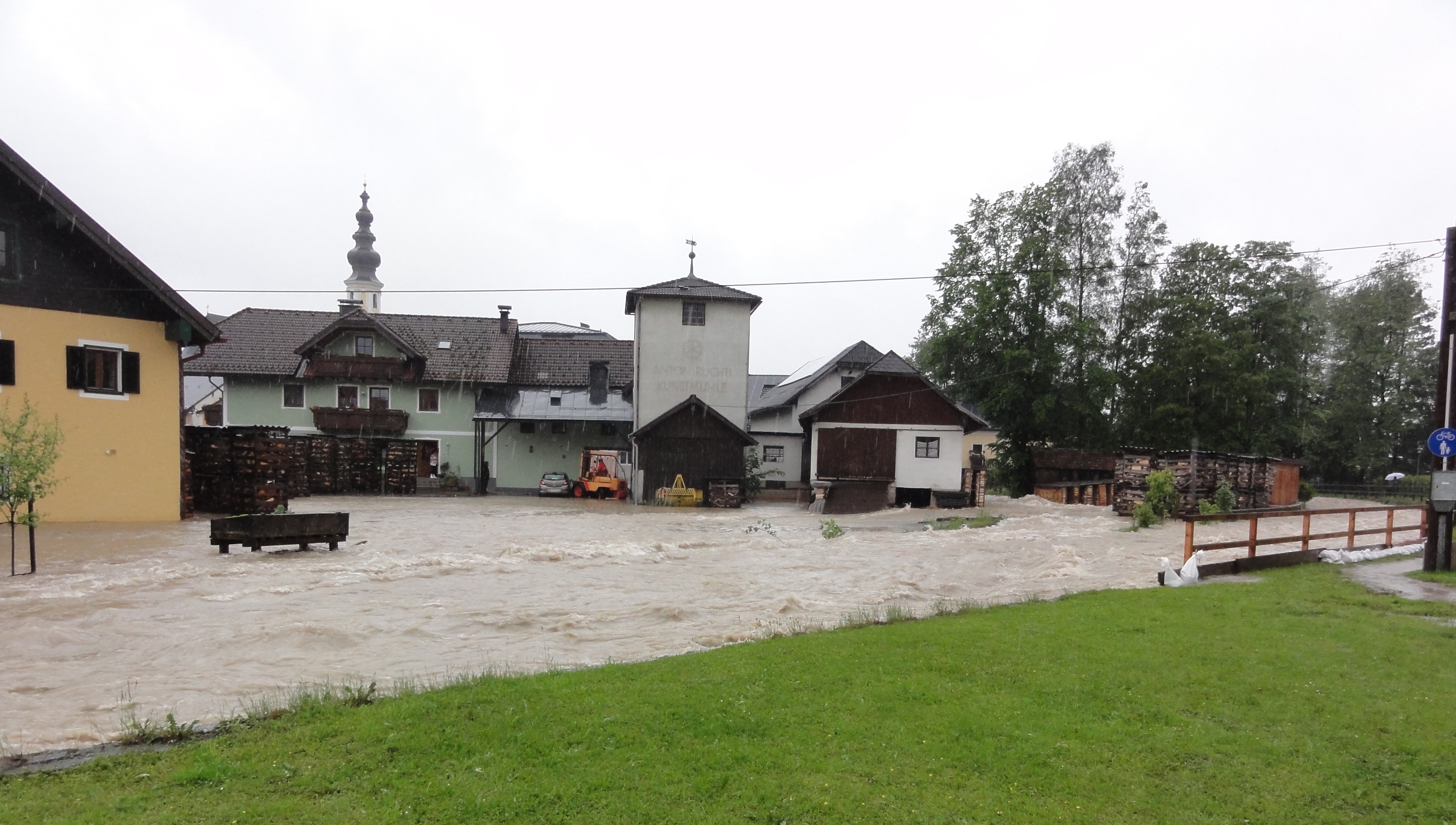 - Hochwasser in Thalgau am 2.6.2013, hier ist man an einer neuerlichen Katastrophe wie 2002 knapp vorbei geschrammt. Hier am Zusammenfluß von Brunnbach in den Fischbach ist immer eine kritische Stelle.