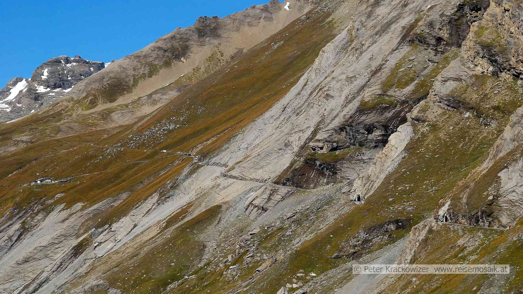 - der Verlauf des Gamsgrubenwegs, links oben im Hintergrund die Oberwalder Hütte, Bildrand links Mitte: die geschlossene Hofmannshütte.