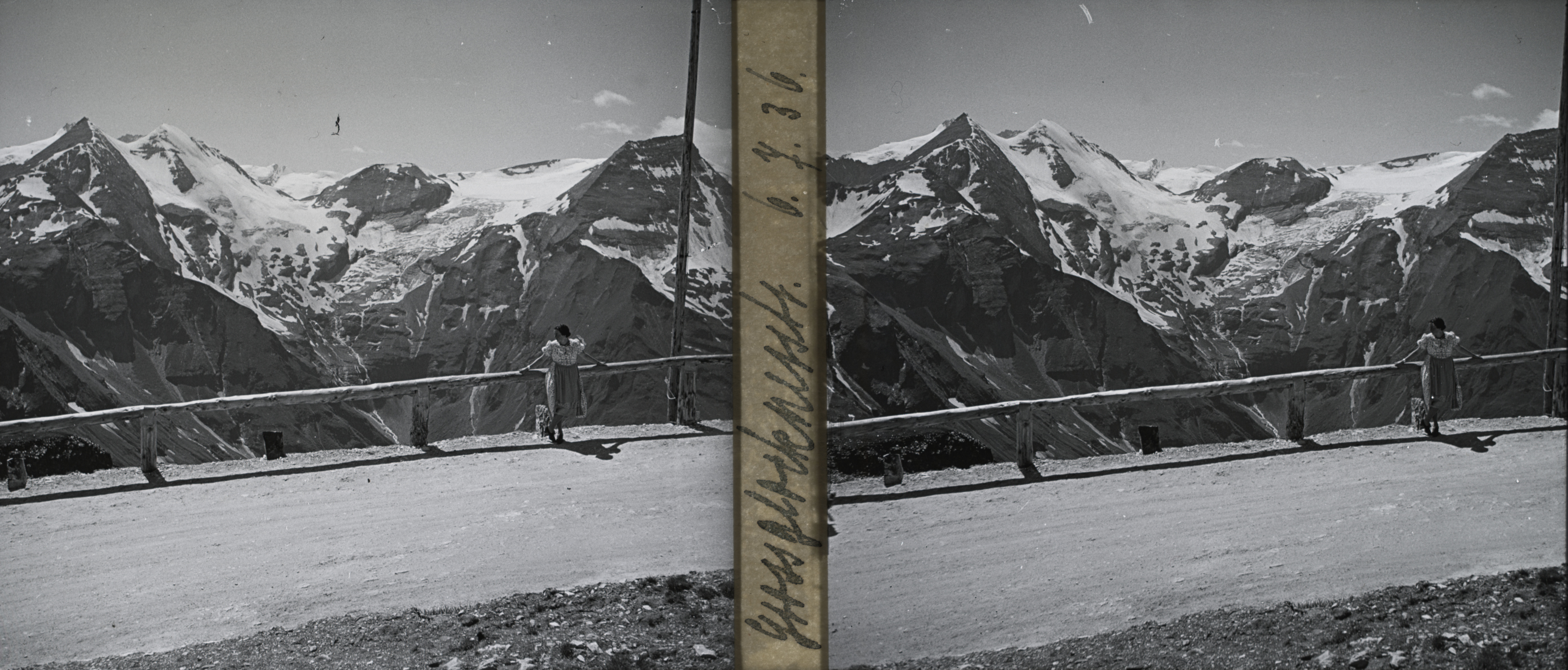 - Blick von der Edelweißstraße an Großglockner Hochalpenstraße mit Eleonore (Lore) Helene Bertolini (* 1906; † 1995) zu (von links) Kapuziner, Sinwelleck, Fuscher-Kar-Kopf, Breitkopf und Hohe Dock. Teil einer Stereoskopie auf Glasplatte (Positiv) schwarz-weiß quer.