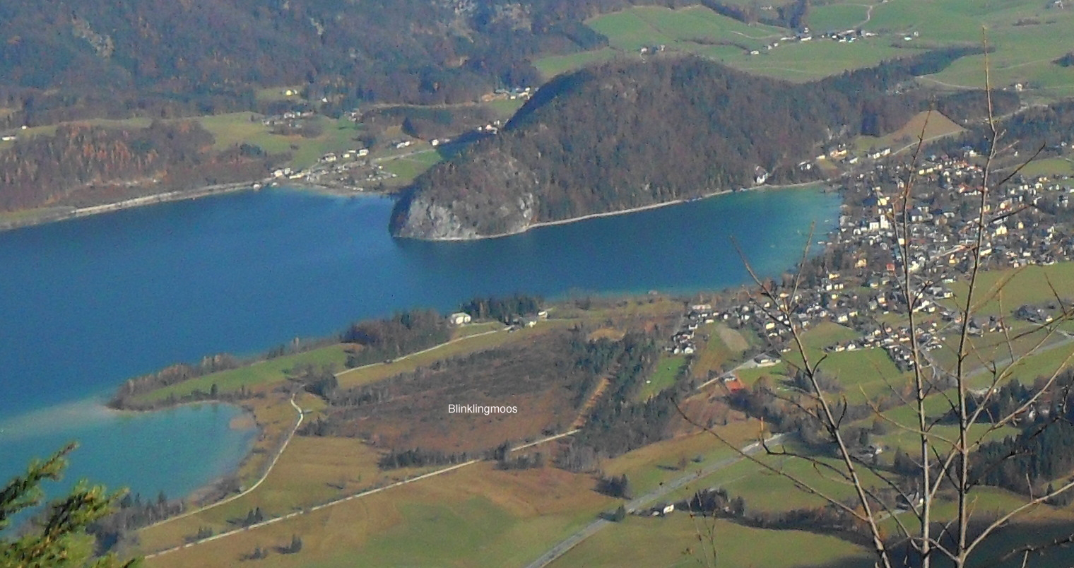 Blinklingmoos, Ansicht von der Bleckwand aus; rechts die Gemeinde Strobl am Wolfgangsee mit dem Bürgl (bereits in Oberösterreich, um den der Bürglstein-Panoramaweg).