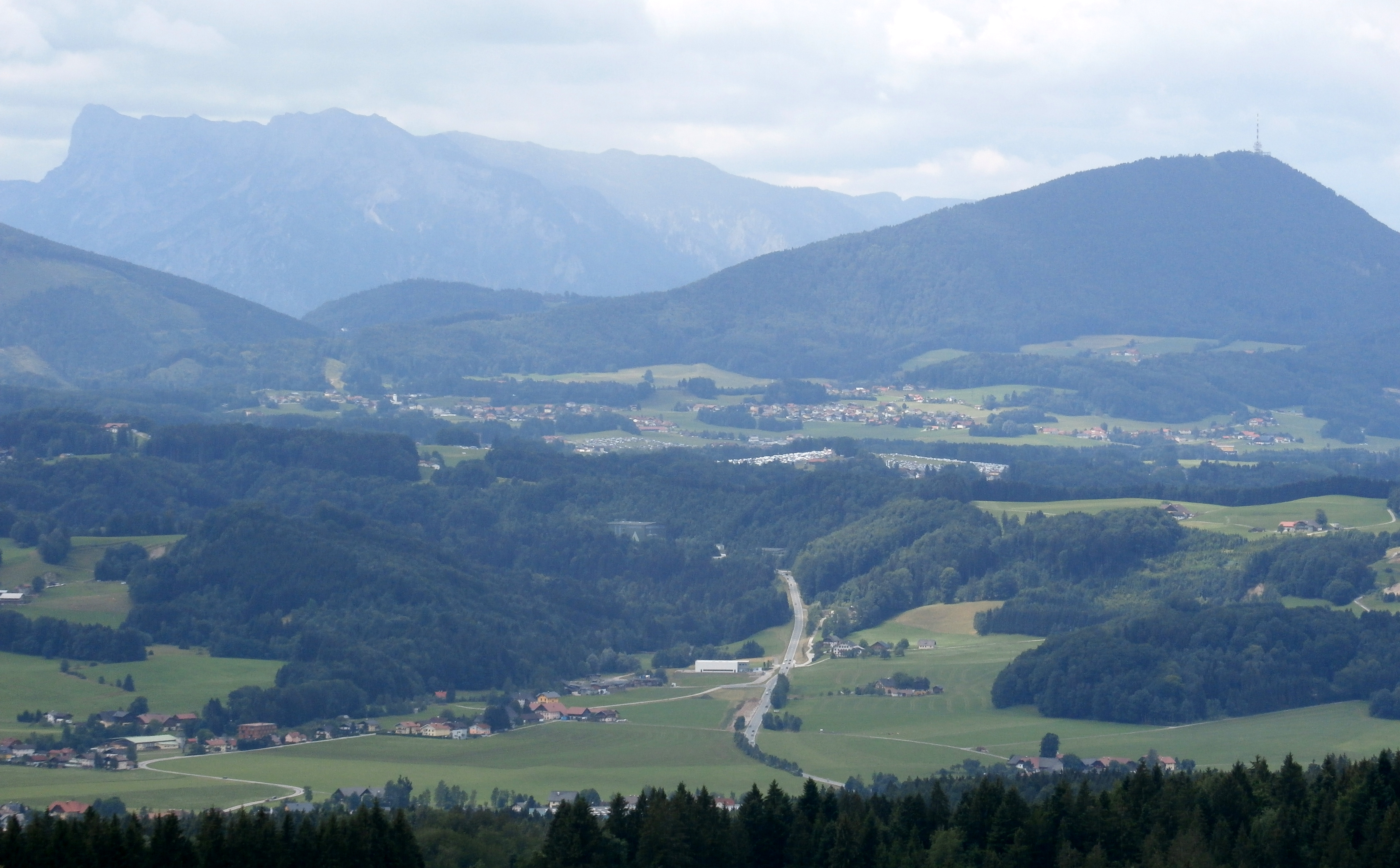 - Verlauf der Russenstraße (Bildmitte) in der umgebenden Landschaft (links Untersberg, rechts Gaisberg)