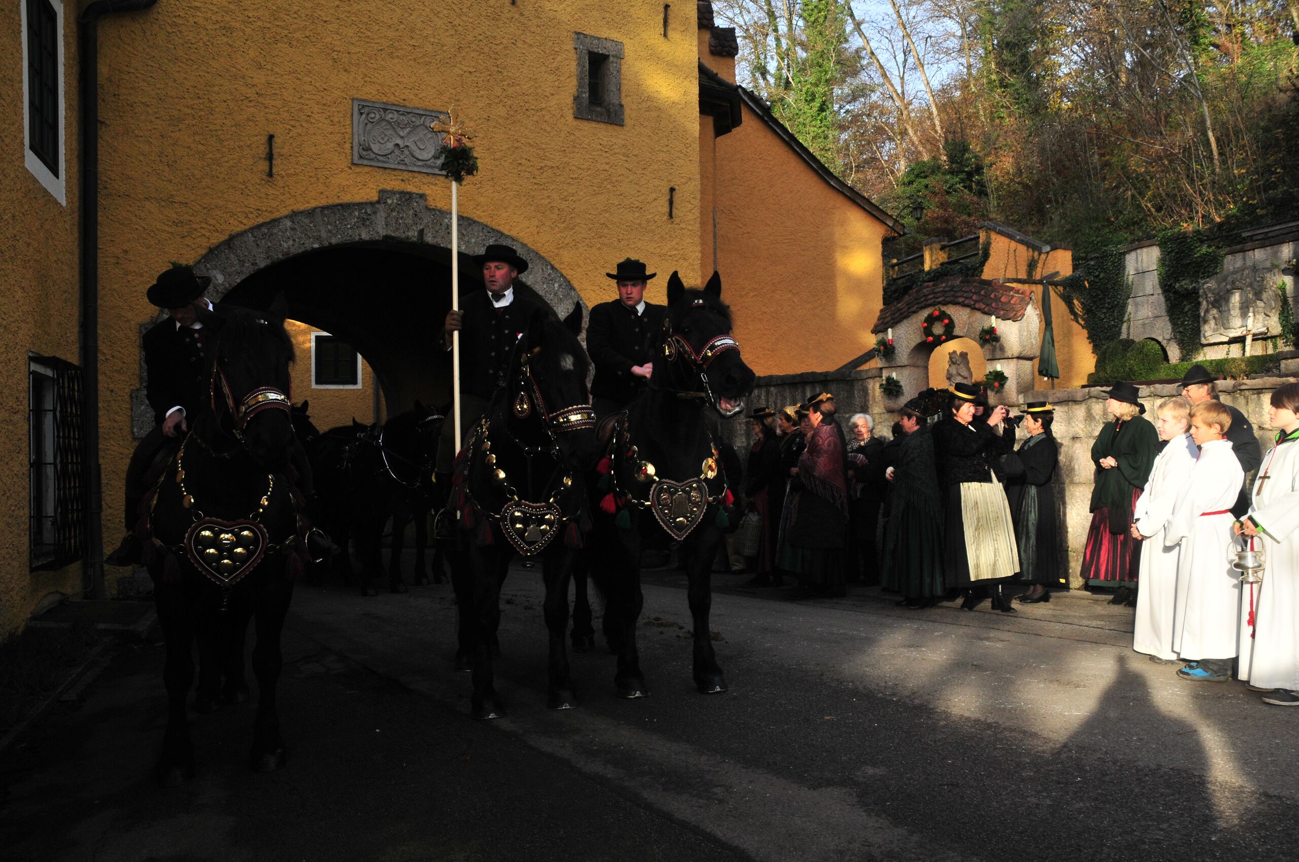 - Vor der Abfahrt des Wallfahrtszuges aus dem Mayr-Melnhofschen Gutshof Glangg (vor der Schlosskapelle)