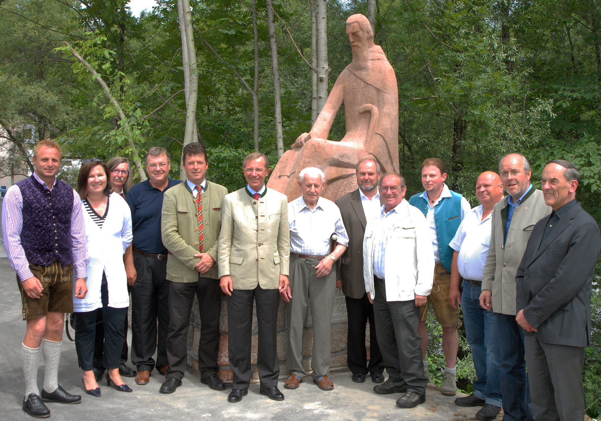 - Tauglbrücke - Die von Hans Pacher 1954 geschaffene Steinguss-Statue des heiligen Severin, des „Apostels von Noricum“, sitzt am Beginn des neuen Radstegs auf der Kuchler Seite. Sie wurde von den Steinmetzmeistern Bertl Ziller jun. und sen. in Adnet renoviert und mit der neuen Tauglmaut-Kapelle gesegnet. Im Bild v.l. Bad Vigauns Vizebürgermeister Alexander Sartori, Kuchls Vizebürgermeisterin Carmen Kiefer, Günter Bauer, die Bürgermeister Raimund Egger und Andreas Wimmer, Landeshauptmann-Stv. Dr. Wilfried Haslauer, Josef Reiter, Pfarrer Gerhard Mühlthaler, der Kuchler Museumsvereins-Obmann Sepp Egger, die Steinmetzmeister Bertl Ziller jun. und sen., Gemeinderat Michael Neureiter und Pfarrer Egon Katinsky