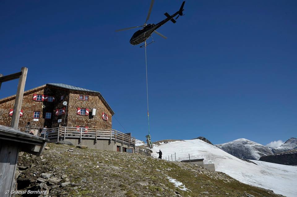 - Die Oberwalderhütte in Glocknergruppe nördlich der Pasterze, Versorgungsflüge mit Helikopter
