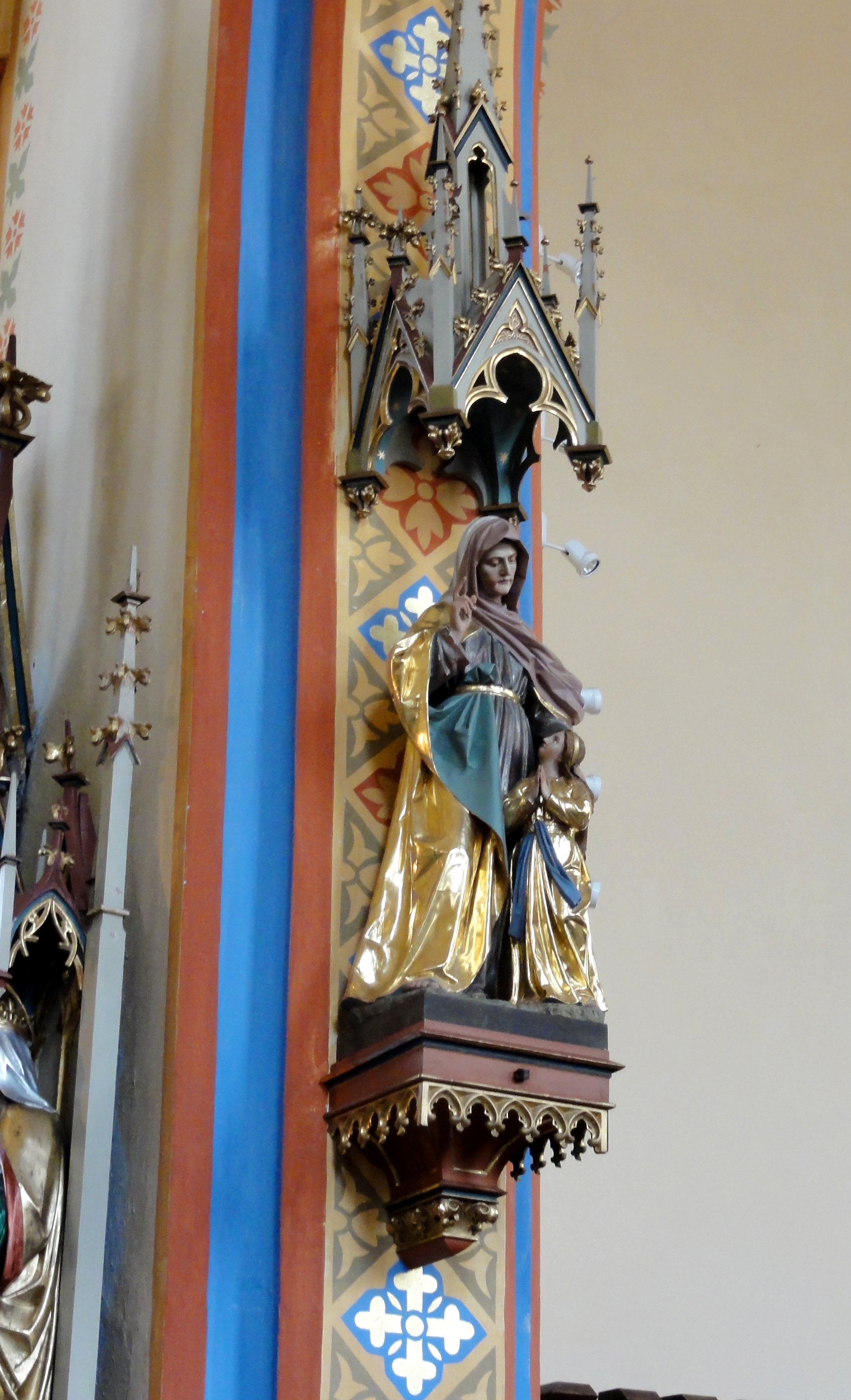 - Statue linke Kirchenseite, Altarbogen, hl. Mutter Anna. Werk des berühmten Holzschnitzers Josef Rifesser (1851-1919) aus Gröden in Südtirol.