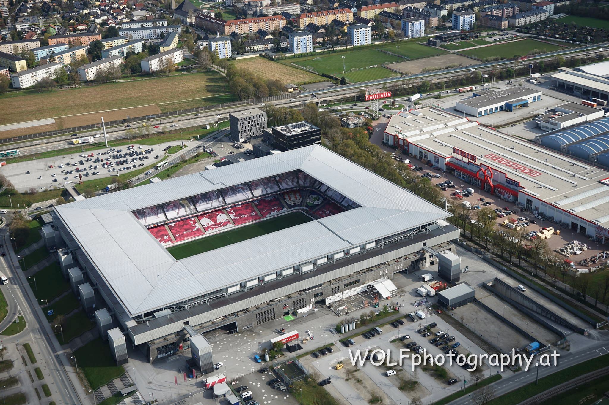 - Hier die Red Bull Arena und ein Teil des Gewerbegebiets Kleßheim in Siezenheim, Gemeinde Wals-Siezenheim. Darüber die A 1 West Autobahn, die Grenze zur Stadt Salzburg, hier mit der Großsiedlung Taxham. Rechts neben dem Stadion verläuft die Kleßheimer Allee.